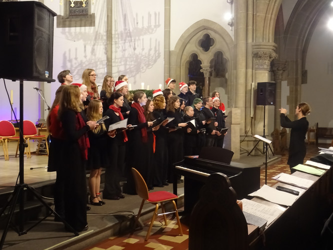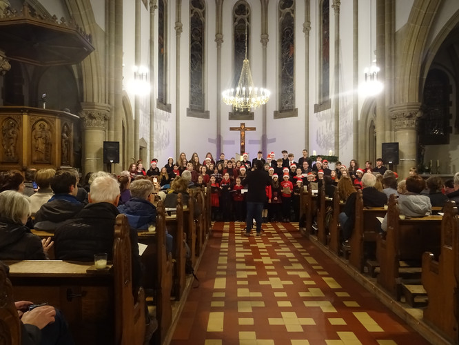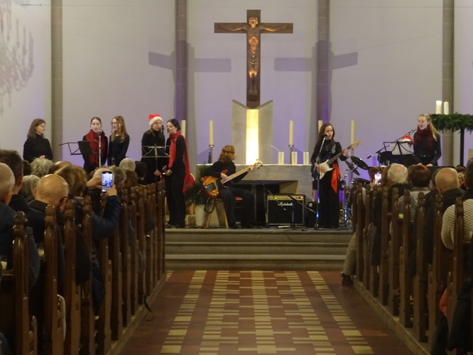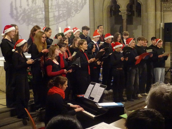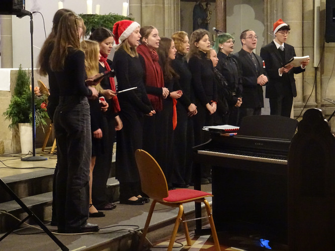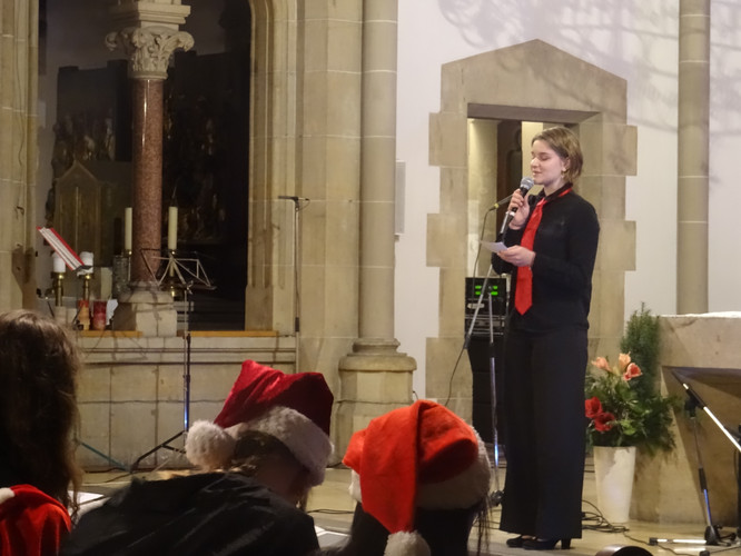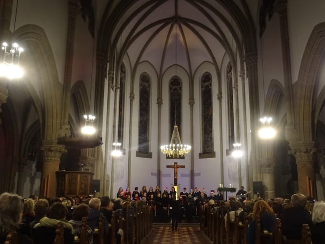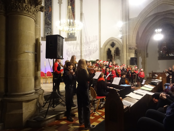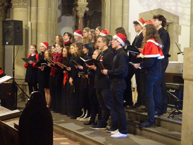 Den größten Raum für ein Adventskonzert seit Langem fanden die Ensembleleiter für dieses Jahr schließlich in der Herz Jesu-Kirche auf der Borsbergstraße in Dresden-Johannstadt, gar nicht weit entfernt von unserem eigentlichen Schulstandort. Schon im Vorfeld hatte Frau Folprecht Sorge, ob sich dieser große Raum überhaupt mit Zuschauerinnen und Zuschauern füllen ließe. Diese Sorge erwies sich nun am Abend des 10. Dezember als unbegründet. Bis auf den letzten Platz war der imposante Innenraum der Kirche belegt. Gegen die Ehrfurcht, die solch ein Raum ausstrahlt, sangen, musizierten und sprachen unsere Ensembles selbstbewusst an und füllten ihn mit weihnachtlichen Klängen und Worten. Elisabeth Baka führte durch das Programm und machte dabei deutlich, auf wie viele verschiedene Ensembles das BeBe mittlerweile stolz sein kann: Jugendchor, Nachwuchschor, Instrumentalensemble, Schulband, Oberstufenchor, Lehrerchor und Lehrerband. Wirklich beachtlich! Doch nicht allein die schiere Masse an Beteiligten beeindruckte, sondern die sympathische Ausstrahlung unsere Akteure, der Stolz, am Ende die schwierige Tonfolge, den sperrigen Text oder das Solo bewältigt zu haben, und vor allem die Freude am gemeinsamen Musizieren. Und mag auch nicht jedes Wort oder jeder Akkord die hintersten Reihen glasklar erreicht haben, die feierliche Stimmung und der vorweihnachtliche Hauch kamen auf jeden Fall an. Um es mit den Worten einer Zuhörerin nach dem Konzert auszudrücken: „Jetzt bin ich weihnachtlich eingestimmt!“ – es ist ihnen allen wieder gelungen! Das alljährliche Adventskonzert ist und bleibt ein, wenn nicht sogar DER Höhepunkt des Schuljahres.