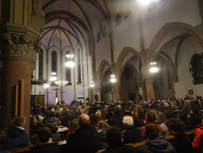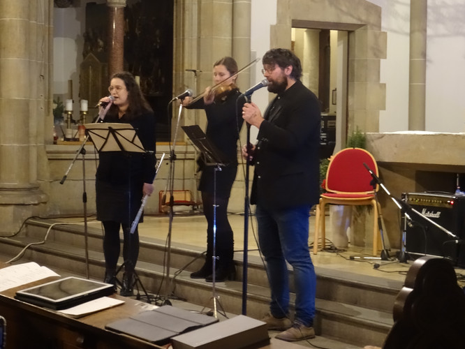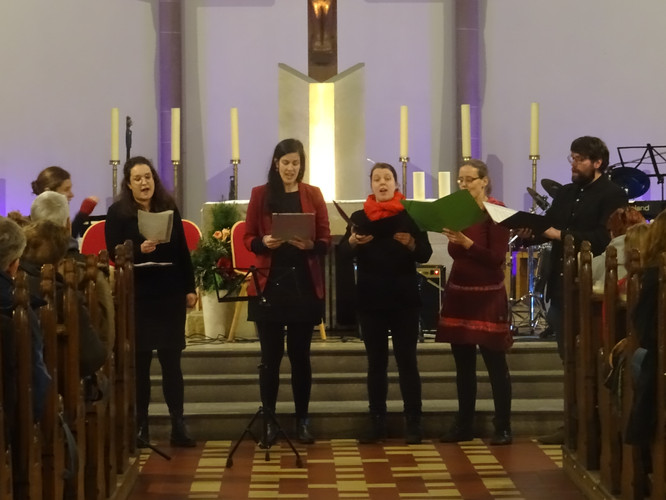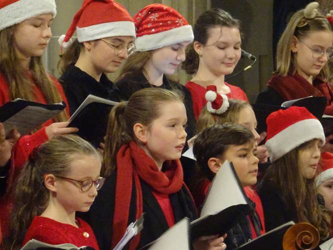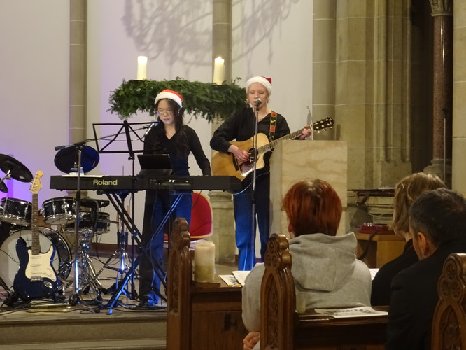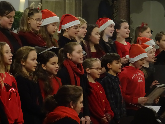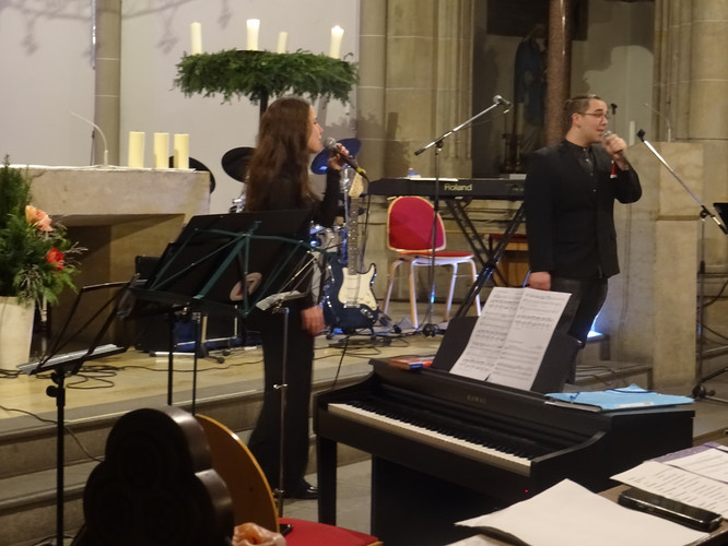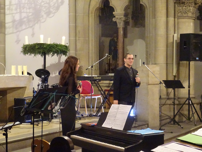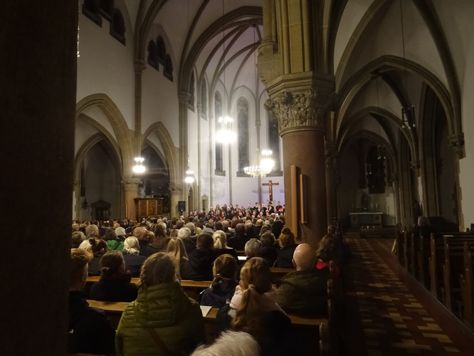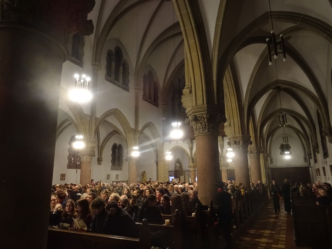 Den größten Raum für ein Adventskonzert seit Langem fanden die Ensembleleiter für dieses Jahr schließlich in der Herz Jesu-Kirche auf der Borsbergstraße in Dresden-Johannstadt, gar nicht weit entfernt von unserem eigentlichen Schulstandort. Schon im Vorfeld hatte Frau Folprecht Sorge, ob sich dieser große Raum überhaupt mit Zuschauerinnen und Zuschauern füllen ließe. Diese Sorge erwies sich nun am Abend des 10. Dezember als unbegründet. Bis auf den letzten Platz war der imposante Innenraum der Kirche belegt. Gegen die Ehrfurcht, die solch ein Raum ausstrahlt, sangen, musizierten und sprachen unsere Ensembles selbstbewusst an und füllten ihn mit weihnachtlichen Klängen und Worten. Elisabeth Baka führte durch das Programm und machte dabei deutlich, auf wie viele verschiedene Ensembles das BeBe mittlerweile stolz sein kann: Jugendchor, Nachwuchschor, Instrumentalensemble, Schulband, Oberstufenchor, Lehrerchor und Lehrerband. Wirklich beachtlich! Doch nicht allein die schiere Masse an Beteiligten beeindruckte, sondern die sympathische Ausstrahlung unsere Akteure, der Stolz, am Ende die schwierige Tonfolge, den sperrigen Text oder das Solo bewältigt zu haben, und vor allem die Freude am gemeinsamen Musizieren. Und mag auch nicht jedes Wort oder jeder Akkord die hintersten Reihen glasklar erreicht haben, die feierliche Stimmung und der vorweihnachtliche Hauch kamen auf jeden Fall an. Um es mit den Worten einer Zuhörerin nach dem Konzert auszudrücken: „Jetzt bin ich weihnachtlich eingestimmt!“ – es ist ihnen allen wieder gelungen! Das alljährliche Adventskonzert ist und bleibt ein, wenn nicht sogar DER Höhepunkt des Schuljahres.