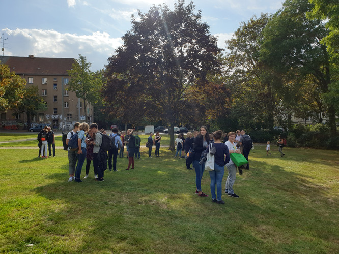 Nach der Pause stellte Barbara Heidrich vom LaNU kurz alle Klimaschulen von Sachsen vor. Diesem Kurzvortrag folgte ein Rundgang, in welchem sich alle Schulen ausführlich präsentierten, austauschten und jeder die Möglichkeit hatte, Aktivitäten der anderen Schulen kennenzulernen, Ideen auszutauschen und ins Gespräch zu kommen. Natürlich machten wir uns fleißig Notizen und nahmen jede Menge neue Anregungen mit. Abgerundet wurde dieser Tag mit einem Stadtrundgang durch den Leipziger Süden und dem anschließenden Abendprogramm, inklusive nachhaltigem Buffet und Live-Musik im Sportgymnasium Leipzig.