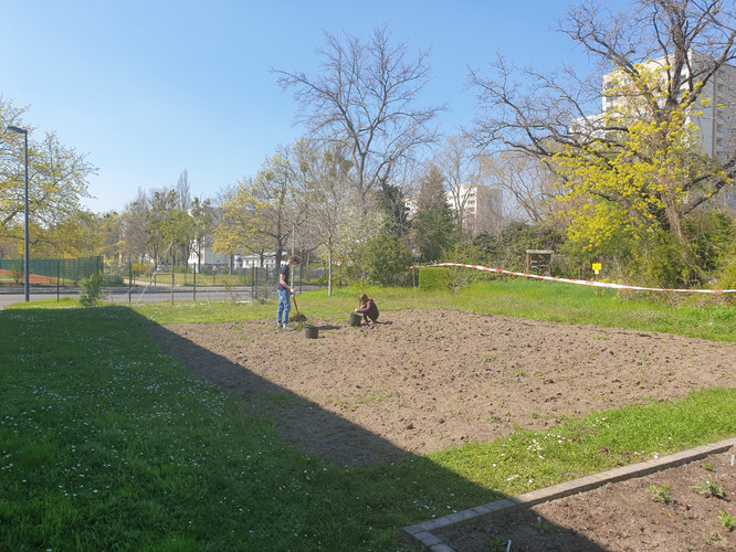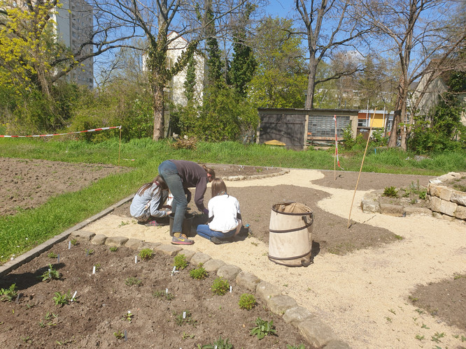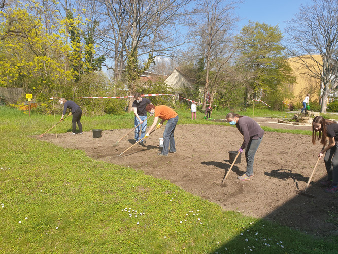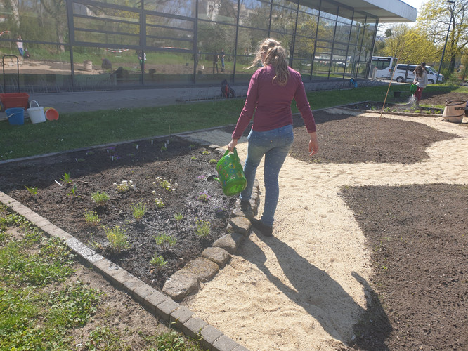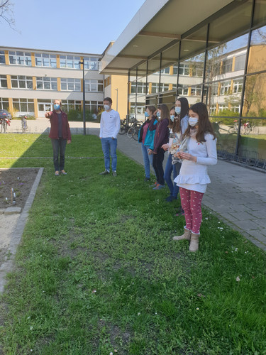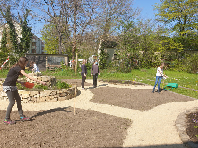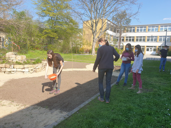 Am 28. April, dem Tag der schriftlichen Abiturprüfung in Biologie (wie passend!), wurden die letzten Planungen für unser Areal neben der Sporthalle in die Tat umgesetzt. Die Aussaat für die Bienenweide stand noch aus, da sie wegen des Wetters verschoben werden musste. Ein sonniger Nachmittag bot die besten Bedingungen für diese Aktion. Kurzfristig fand sich eine Gruppe von Helferinnen und Helfern, die sich bereitwillig an die Arbeit machte.