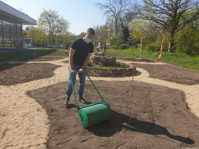 Zunächst war es nötig, noch einmal Unkräuter zu beseitigen. Anschließend wurde der Boden mit dem Rechen geglättet, so dass eine ebene, locker krümelige Oberfläche entstand. Auf die so vorbereiteten Flächen wurden die Samen handwürfig und gleichmäßig aufgebracht, was alle Beteiligen toll gemacht haben! Zu guter Letzt wurden die Flächen gewalzt. Flatterbänder sorgen nun dafür, dass Vögel von den Samen ferngehalten werden. Die beim letzten Arbeitseinsatz bepflanzten Flächen wurden bei der Gelegenheit auch noch einmal gegossen. Nach anderthalb Stunden waren die Arbeiten abgeschlossen.