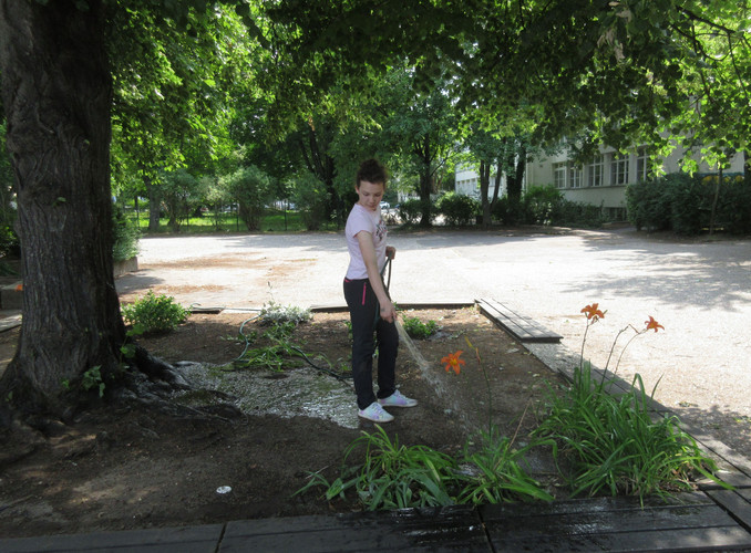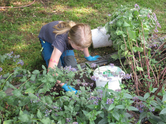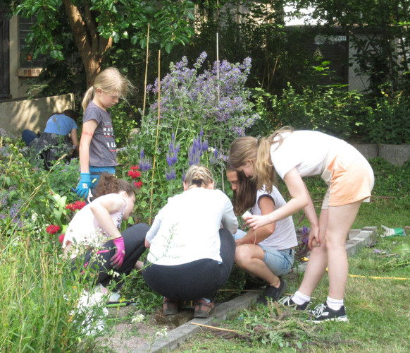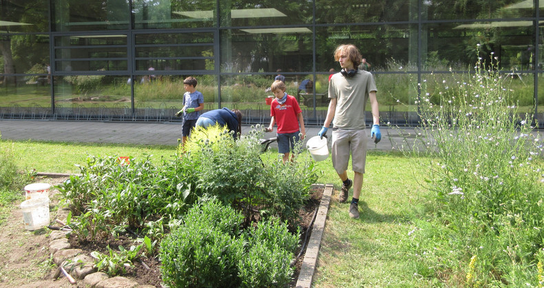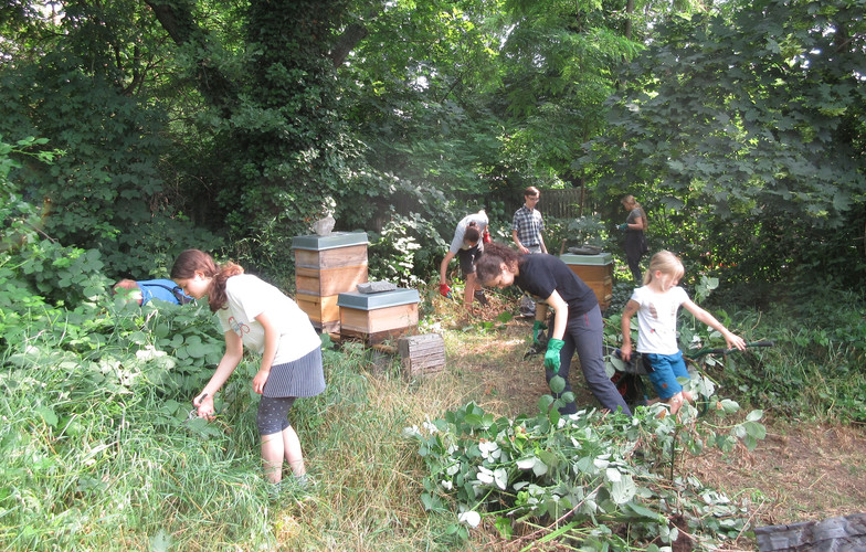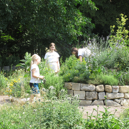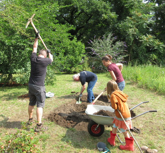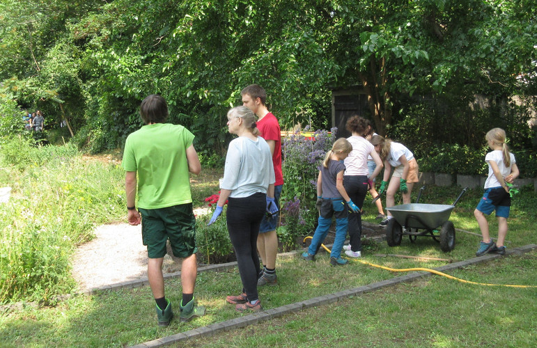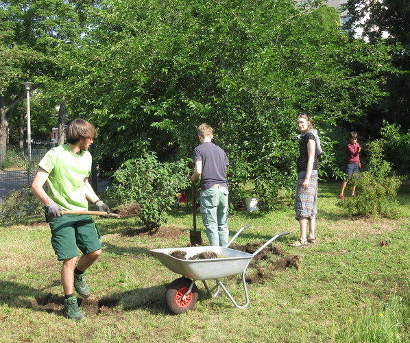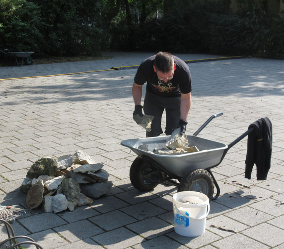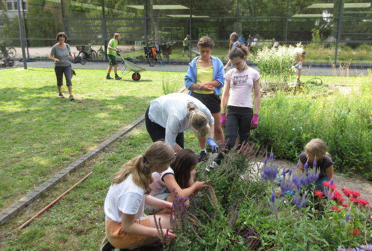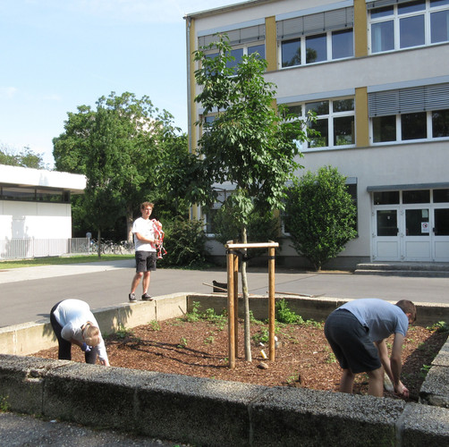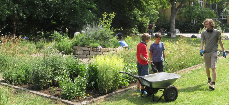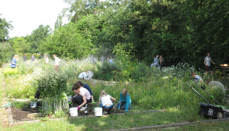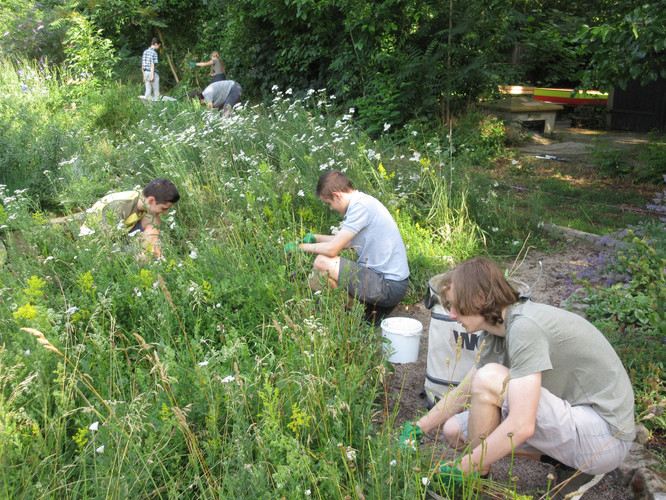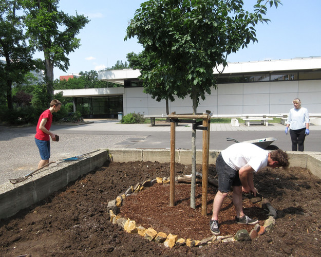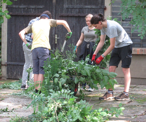 Zum dritten Mal in diesem Schuljahr rief die AG BNE zum Arbeitseinsatz an Kräuterspirale und Bienenwiese auf und wieder kamen über 30 Schülerinnen und Schüler, Eltern und Lehrerinnen und Lehrer. Darunter waren nun schon erfahrene Helferinnen und Helfer, die auch gleich zielstrebig loslegten. Bei sehr schönem Wetter und zunächst angenehm kühlen Temperaturen gingen die Arbeiten gut voran. Unter Leitung von Frau Klemm und Herrn Junge wurden die Themenbeet durchgejätet, Blumen hochgebunden, Bäume beschnitten, Baumscheiben erneuert, Wildwuchs von Akazien und Brombeersträuchern beseitigt sowie die Sitzecke gesäubert und wieder schick gemacht. Schüler des Bio-Leistungskurses von Frau Klemm gestalteten die Pflanzfläche um unseren Klimaschulbaum mit Steinen, Wurzeln, Rindenmulch und Pflanzerde und bereiteten sie somit für Einpflanzungen vor. Außerdem wurden Erdarbeiten für das geplante Sukkulentenbeet durchgeführt. Die gemeinsame Arbeit hat wieder Spaß gemacht und das Ergebnis kann sich sehen lassen.