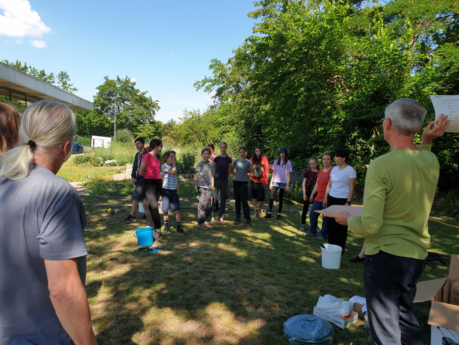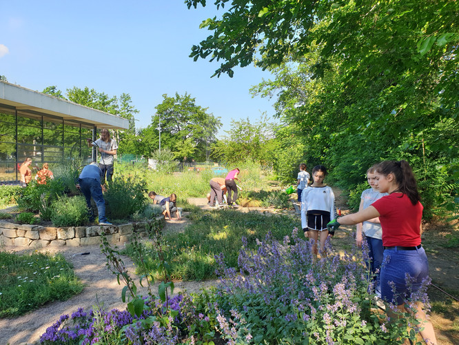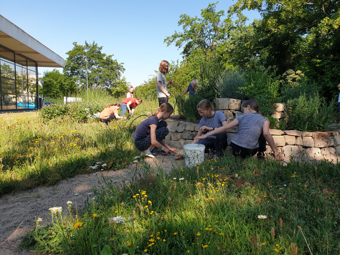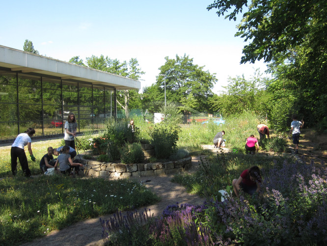 Bei schönstem Wetter trafen wir uns gegen 9 Uhr und starteten unseren Arbeitseinsatz. Wir konnten ca. 30 Schüler verschiedenster Jahrgangsstufen und Eltern, aber auch Lehrerinnen und Lehrer als Teilnehmer begrüßen. Herr Wagner hatte den Hut auf und eröffnete uns in einem kleinen Monolog die wichtigsten Themen des Projektes und Vorhaben des Arbeitseinsatzes. Wunderbar war es anzusehen, dass wenig Unkraut, aber viel Gewächs und Blüten zu finden waren.