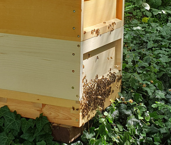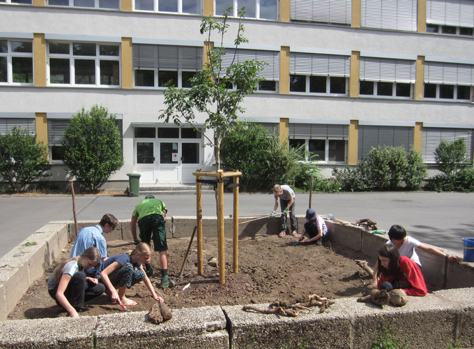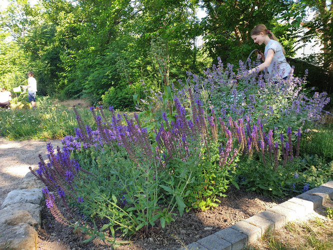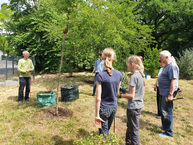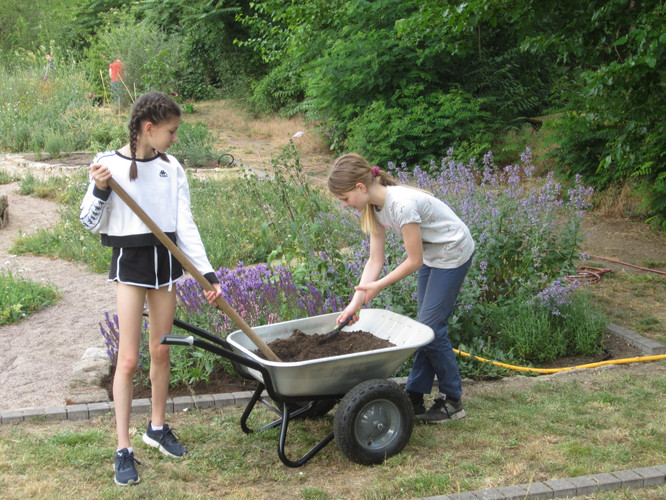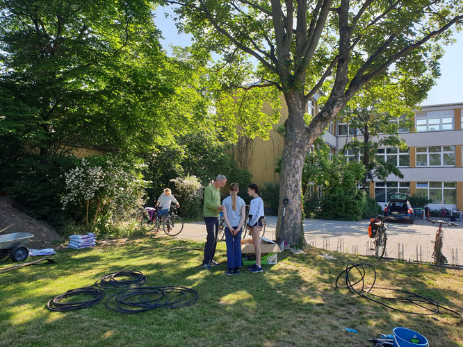 Die Bienen erfreuen sich daher an ausreichend Nahrung und auch der Maulbeerbaum trägt ordentlich Früchte. So wurde schließlich auch die Bewässerungsanlage eingepflegt, so dass nicht nur die Bienen ihre Freude haben, sondern auch die Biolehrkräfte und ihre Klassen Erfahrungen an den vorhandenen Pflanzen sammeln können. Auch um den Klimaschulbaum wurde sich gekümmert, dort wurde Unkraut gejätet und die Erde gelockert. Zusätzlich bekam er noch etwas Aufschüttung und Wasser, so dass wir hoffen, diesen Baum behalten zu können und wachsen zu sehen.