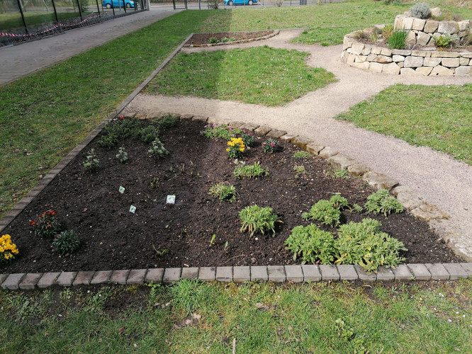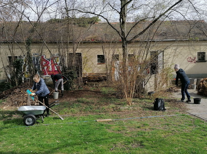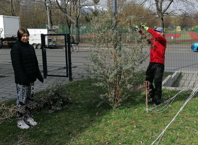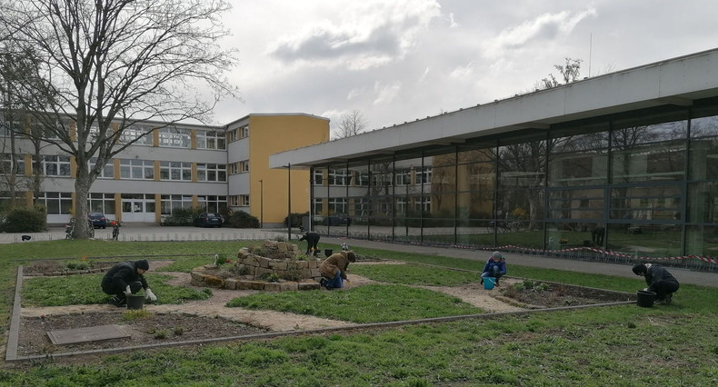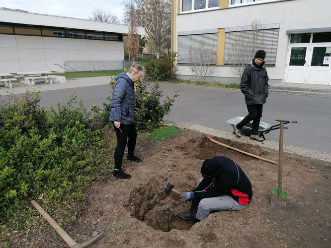 Das Wetter war sonnig und nicht windig, also viel besser als gedacht. Immerhin hatten sich 13 Teilnehmer eingefunden und machten sich gleich an die Arbeit: Die Themenbeete wurden durchgejätet, die Erde aufgelockert, neue Blumenerde aufgebracht und ein paar Blumen nachgepflanzt. Die Wege um die Kräuterspirale wurden vom Unkraut befreit und die Brombeersträucher um das Insektenhotel zurückgeschnitten. Der kleine Apfelbaum wurde freigelegt und ebenfalls verschnitten. Bei den drei Sommerfliederbüschen wurden die alten verblühten Zweige entfernt. Am Ende nahmen Frau Klemm und Herr Junge eine Bodenprobe aus dem Hochbeet auf dem Schulhof als Vorbereitung für den neuen Klimabaum.