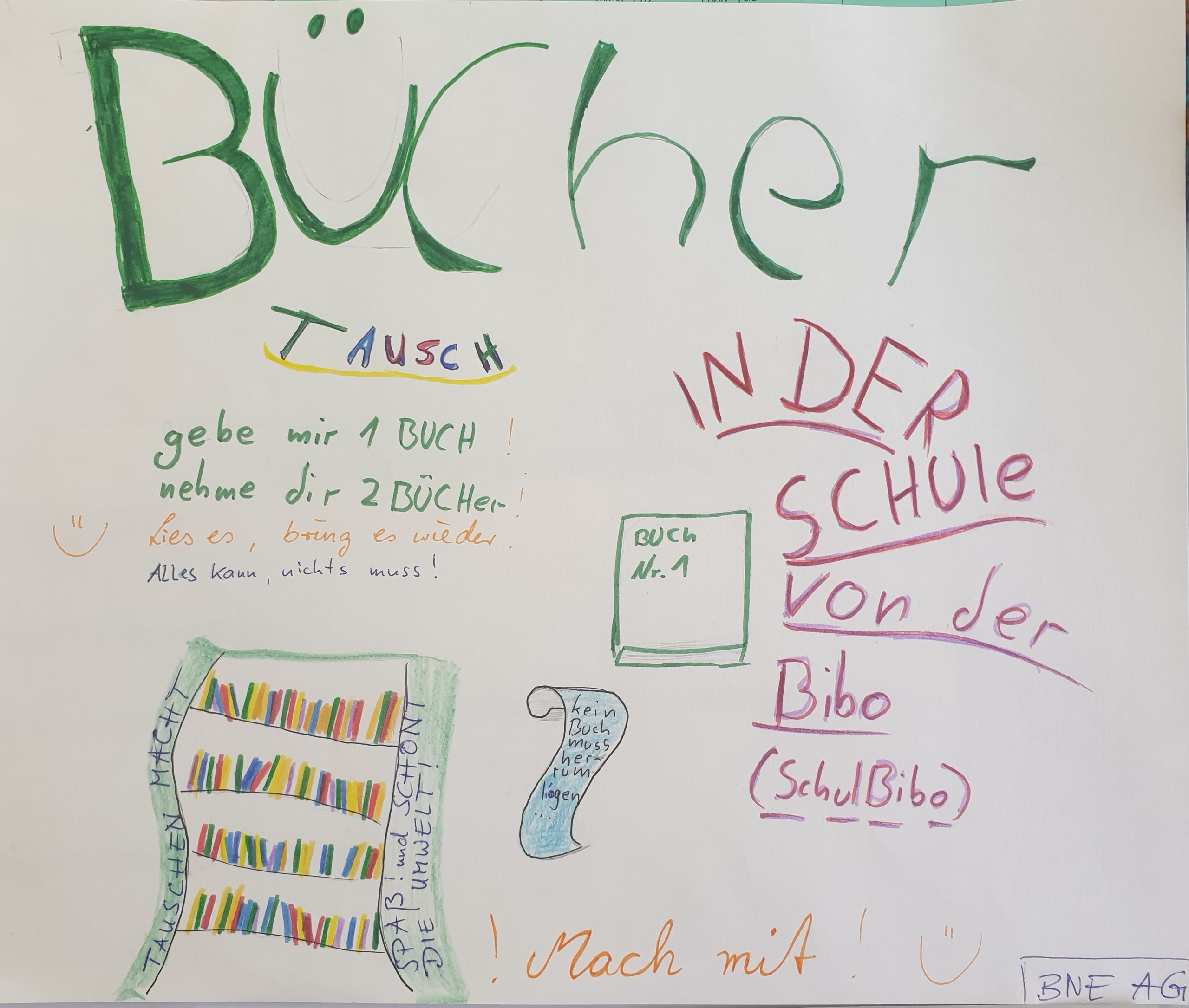 Neben dem Kleidertausch soll es nun auch bald möglich sein, Bücher zu tauschen. Dafür ist ein Regal in der Schulbibliothek geplant. Alle sind aufgerufen, ihre Regale auszumisten und Bücher, die nur verstauben und zu Hause Platz wegnehmen, mitzubringen. So können sie von weiteren Schülern und Schülerinnen gelesen werden.