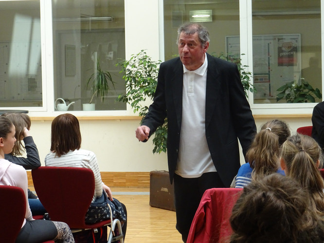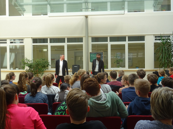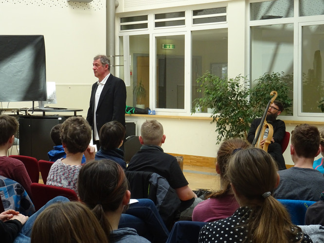 Wer kennt diese Verse (und manche darauf folgende) nicht? Alle Schülergenerationen sind v.a den klassischen Balladen Goethes und Schillers im Deutschunterricht begegnet, viele mussten sie auswendig lernen, rezitieren und dabei eine enorme Textmenge bewältigen. Dass Balladen mehr sind als besonders lange Gedichte in schwer verständlicher Sprache, zeigten Jürgen Stegmann und Benni Cellini unseren Siebtklässlern am Donnerstag, den 21. März, in der Aula des BeBe. Sie präsentierten ein Programm mit eigenen Interpretationen klassischer Balladen. Begleitet von atmosphärischen Klängen eines E-Cellos, gespielt von Benni Cellini, erweckte Jürgen Stegmann durch Sprache, Spiel, Requisiten und so manches Augenzwinkern die Helden, Damen, Söhne, Väter, Meister und Geister der Balladen zum Leben. Unsere Schüler waren von der humorvollen Interpretation durchaus angetan und ließen sich für ihren eigenen Balladenvortrag inspirieren.
