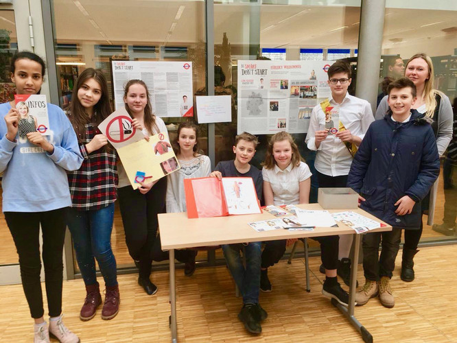 Unsere Klasse beteiligt sich dieses Jahr an einem Nichtraucherprojekt namens „Be smart, don’t start“ und präsentierte dazu auch einen Stand am Tag der offenen Tür. Wir verteilten Flyer und informierten die Leute über dieses Projekt. In unserem Alter ist die sogenannte Einstiegsphase zum Rauchen besonders hoch und es soll verhindert werden, dass Jugendliche in unserem Alter anfangen zu rauchen, da es besonders Kindern und Jugendlichen, die noch im Wachstum sind, negativ beeinträchtigt. Damit es aber gar nicht dazu kommt, dass einer von uns anfängt, nehmen wir an dem Präventionsprogramm teil. Wir erhielten von den Organisatoren viele Informationen dazu und sprachen in der Klasse darüber. Zudem unterzeichneten wir alle einen Nichtrauchervertrag und melden uns jeden Monat bei den Veranstaltern von "be smart, don’t start" zurück und bestätigen, dass keiner von uns aus der Klasse mit dem Rauchen angefangen hat. Deutschlandweit nehmen Tausende von Klassen daran teil und es locken sogar Gewinne und Auszeichnungen. Viele Eltern und auch Schüler fanden die Vorstellung des Projekts und die Infos zum Thema Rauchen, die wir selber erstellt haben, eine gute Sache und lobten unseren Stand. Weitere Infos zum Projekt gibt es auf der Homepage: https://www.besmart.info/