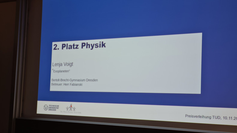 Auf Anregung von Herrn Fabianski wurde Lenjas Arbeit für den Hans Riegel-Fachpreis eingereicht und Lenja am 10. November an der TU Dresden mit einem 2. Preis im Fachbereich Physik geehrt. Herzlichen Glückwunsch!