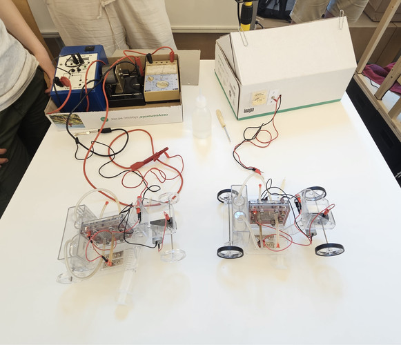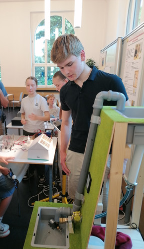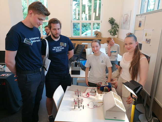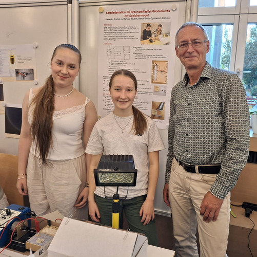 Am 20.06.2025 fand die alljährliche Lange Nacht der Wissenschaften an der Technischen Universität Dresden und an der HTW Dresden statt. Drei unserer Schülerinnen und Schüler, Alexandra Brechel und Tamara Beutlich aus der Klasse 9/4 sowie Johannes Köhler aus dem Kurs 11MA1, stellten ihre Projekte an der HTW im Rahmen der Talentschau „schlau gedacht – gut gemacht“ aus und beantworteten neugierigen Gästen ihre Fragen. Tamara und Alexandra präsentierten ihre selbstgebaute Solarladestation für Brennstoffzellen-Modellautos und erklärten, wie man damit emissionsfrei die Energie der Sonne zunächst in chemische Energie des Wasserstoffs und dann in Bewegungsenergie der Modellautos umwandeln kann. Johannes baute im Rahmen seiner komplexen Leistung ein funktionstüchtiges Modell eines Pumpspeicherkraftwerks, mit dem er anschaulich zeigen konnte, wie man die kinetische Energie des Wassers in elektrische Energie umwandeln kann und zudem eine umweltfreundliche Möglichkeit hat, Energie zu speichern.