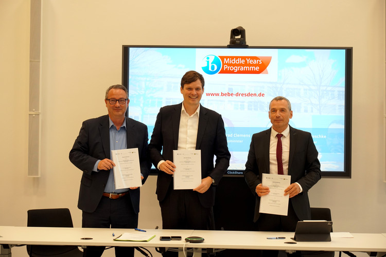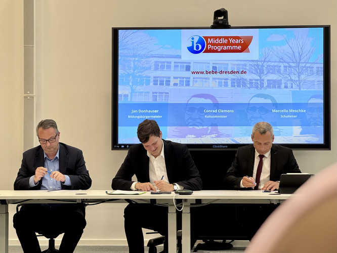 Dresden wird internationaler, das BeBe auch! Schon seit einigen Jahren siedeln sich immer mehr internationale Firmen im „Saxon Silicon Valley“ in und um Dresden an. Um qualifizierten Fachkräften und ihren Familien ein attraktives Lebensumfeld u.a. durch eine adäquate Schulbildung für deren Kinder zu ermöglichen, investieren Stadt und Land in die internationale Bildung. Neben der privaten Dresden International School sollen ab dem kommenden Schuljahr auch am Bertolt-Brecht-Gymnasium Dresden Kinder internationaler Fachkräfte auf Englisch unterrichtet werden. Heute trafen sich im Stadtforum Kultusminister Conrad Clemens, Vertreter der Stadt Dresden, unser Schulleiter Marcello Meschke sowie Schülerinnen und Schüler und Lehrkräfte unseres Gymnasiums zur Unterschrift der Absichtserklärung zur Einrichtung einer MYP-Klasse an unserer Schule. Das Bertolt-Brecht-Gymnasium wird dadurch mit den Mitteln ausgestattet, ab dem kommenden Schuljahr eine internationale Klasse einzurichten, die ab der Klassenstufe 6 nach dem Curriculum des international anerkannten MYP unterrichtet wird. (Auch der dafür dringend notwendige Neubau unserer Schule kam in der Pressekonferenz zur Sprache und alle Parteien signalisierten ihr Interesse an einem geeigneten Gebäude für eine international wettbewerbsfähige Schule.)