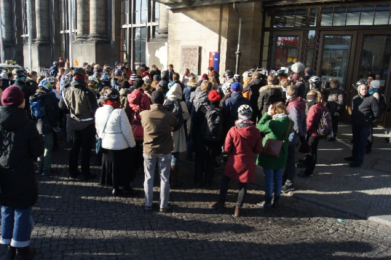 Am Sonntag, dem 13.11.2016, bei herrlichem Sonnenschein, aber Temperaturen um den Gefrierpunkt, radelten ca. 200 Teilnehmer auf dem „Weg der Erinnerung“ durch Dresden und erfuhren, aber erspürten auch eine Menge über die Schwierigkeiten, nach dem Zweiten Weltkrieg hier in Dresden eine neue jüdische Gemeinde (wieder)aufzubauen. Wie ein Leitmotiv zog sich der Fakt durch die Veranstaltung, dass die Bombardierung und Zerstörung Dresdens am 13. Februar 1945 für einige Dresdner Juden die Rettung bedeutete. Denn weil die Bahnhöfe zerstört waren, kam auch die Deportation zum Erliegen. Bereits zum fünften Mal gestalteten Schüler des katholischen Religionsunterrichts unserer Schule unter der Federführung von Frau Wenzel eine Station des „Weges der Erinnerung“. Erstmalig war auch eine kleine Gruppe von BeBeSchülern mit ihren Eltern und Lehrern mit im Publikum. Im Dankesschreiben der Gesellschaft für Christlich-Jüdische Zusammenarbeit Dresden e.V. heißt es: „Liebe Schülerinnen und Schüler der katholischen Religionsgruppe 10, […] gemeinsam mit eurer Lehrerin Frau Wenzel habt ihr die Station am Bahnhof Neustadt eindrücklich gestaltet. Ihr habt berichtet, wie Margot und Leonard Natowitz nach Jahren in KZs nach Dresden zurückkamen und einander wiedertrafen, wie ihnen Freundschaft begegnete, aber auch Hass, und wie sie beide Deutschland endgültig verließen. Es war ein gelungener Tag und Ihr habt zum Gelingen wesentlich beigetragen. Habt herzlichen Dank dafür“. Auch wir danken euch für euren Einsatz und hoffen, dass diese recht stille Tradition auch in den nächsten Schuljahren ihre Fortsetzung und vielleicht auch etwas mehr Publikum findet.