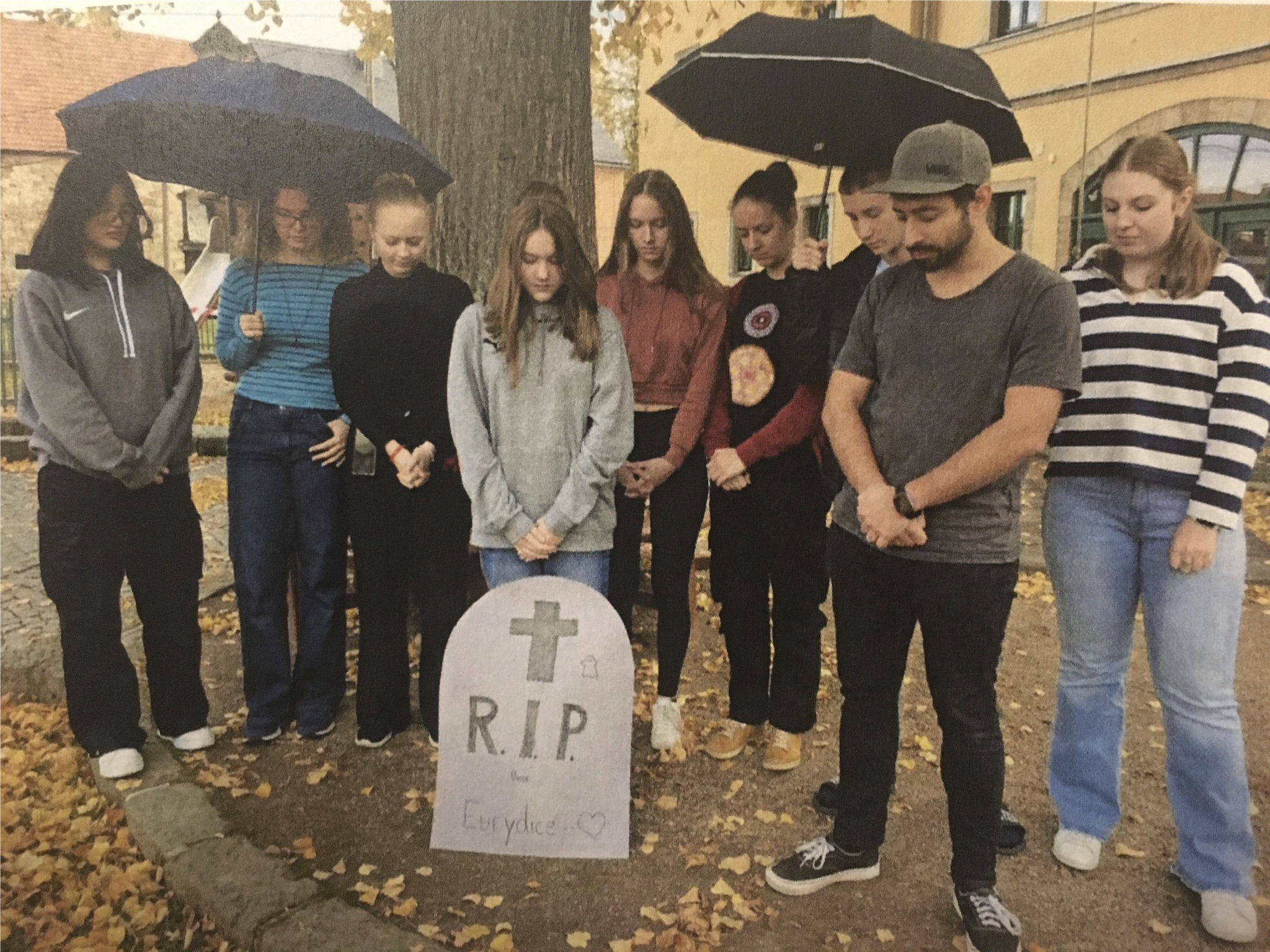 Der Großteil der teilnehmenden Schülerinnen und Schüler reiste, so wie ich, mit einem Reisebus zur Unterkunft. Als wir ankamen, wurden wir in unsere Sprachgruppen eingeteilt: Latein, Französisch, Spanisch und Russisch. Das Ziel jeder Gruppe war es, in den folgenden drei Tagen ein Theaterstück vorzuführen. Es waren jeweils acht Schülerinnen und Schüler, eine Lehrkraft und gegebenenfalls noch eine Lehrkraft in Ausbildung pro Sprachgruppe. Jeder Tag wurde perfekt geplant: Am ersten Tag, also am Tag der Ankunft, wurde das Skript des Theaterstücks geschrieben. Unsere Geschichte war eine moderne Fassung der Geschichte, in der Orpheus versucht seine Frau Eurydike aus der Unterwelt wieder in die Welt der Lebenden zu führen und sie dabei, da es der Wille der Götter ist, nicht anschauen darf. Bei seinem Besuch in der Unterwelt wird er von mehreren bereits verstorbenen Musikern wie Michael Jackson oder John Lennon aufgehalten, welche ihn zwingen verschiedenste Sachen zu vollführen. Er meistert sie und gelangt am Ende zu seiner Frau Eurydike. Während eines hitzigen Streits vergisst er vollkommen den Willen der Götter und dreht sich um. Er schaut seiner Frau das letzte Mal in die Augen und wird gegen seinen Willen zurück in die Welt der Lebenden gerissen. Hier trauert er um seine Frau und die Vorhänge schließen sich.
