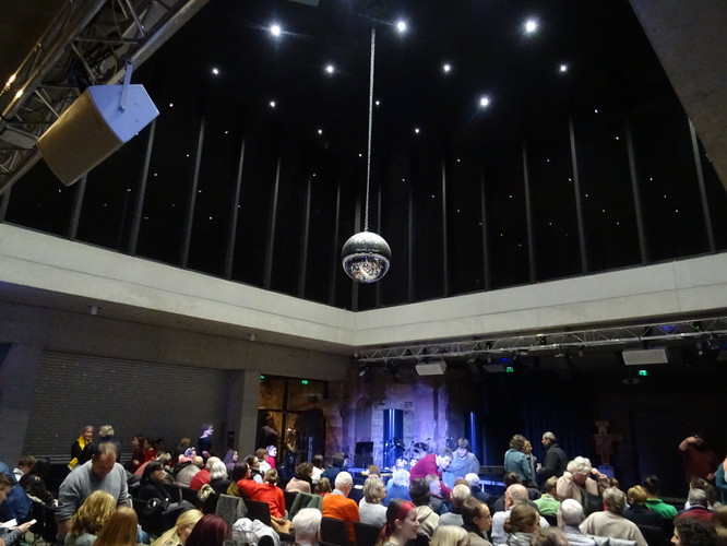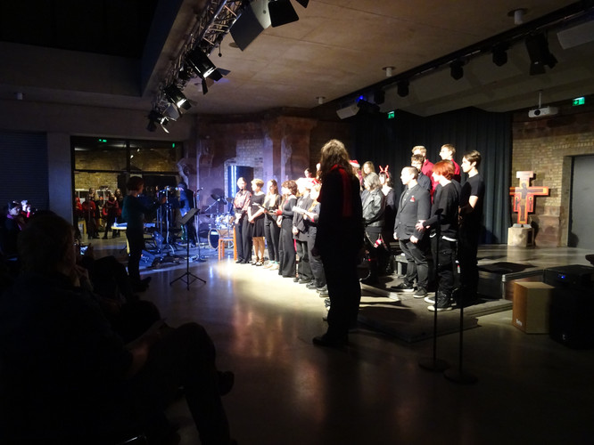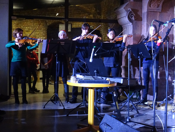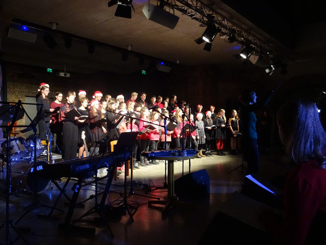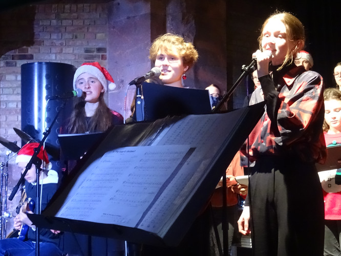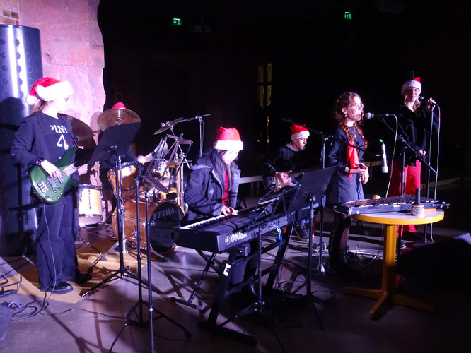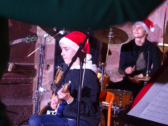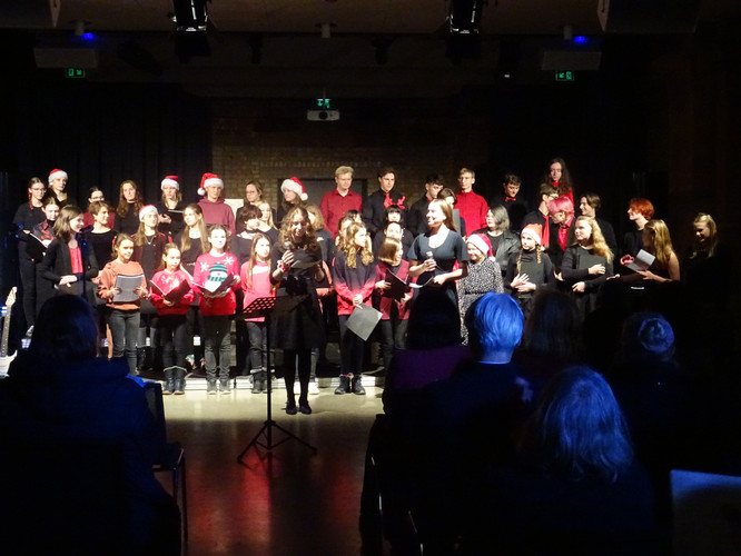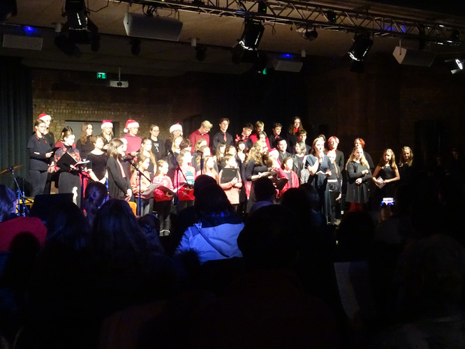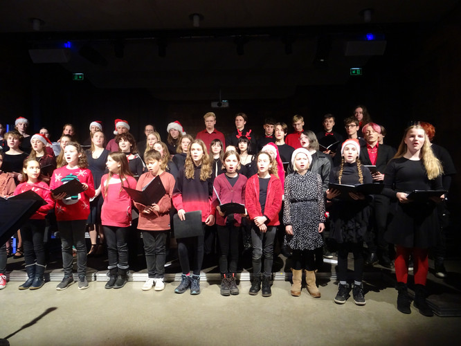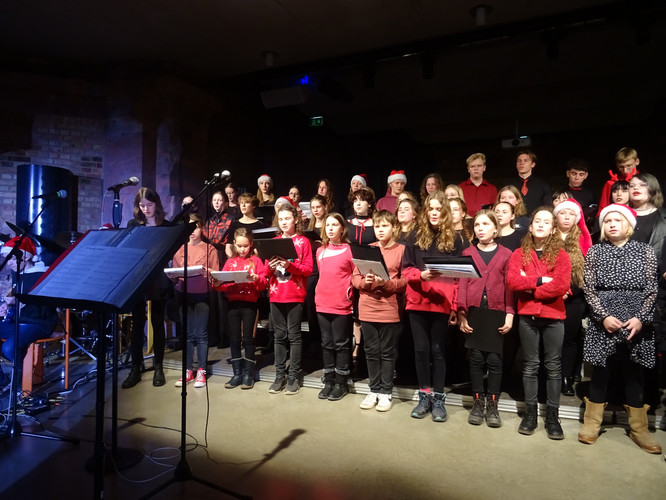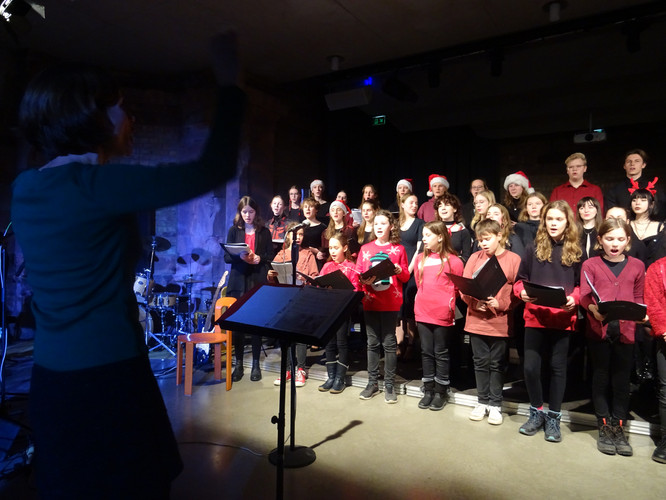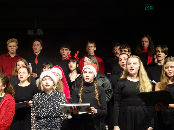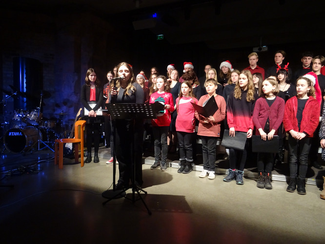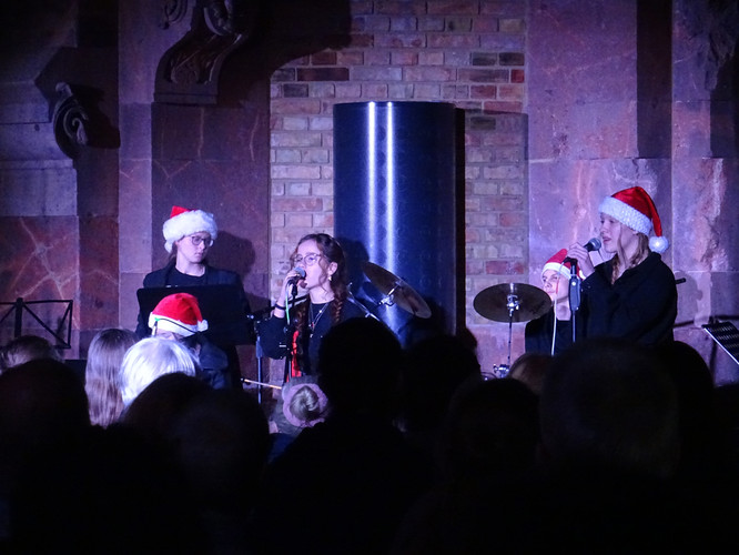 Mitten in einer der stressigsten Phasen des Schuljahres, die gemeinsam mit der Erkältungswelle die Schülerinnen und Schüler und die Lehrerinnen und Lehrer des BeBe fest im Griff hatte, sorgten die Chöre, Bands, Sängerinnen sowie Instrumentalisten für einen dringend notwendigen Moment der Besinnung und Freude: Nach zwei Jahren Zwangspause und digitalen musikalischen Weihnachtsgrüßen standen sie am Abend des 8. Dezember in der Jugendkirche Trinitatiskirche mit einem ausgewählten Programm an Songs of Christmas live vor dem Publikum. Bereits eine halbe Stunde vor Beginn war angesichts des Besucherstroms klar, dass es wichtiger war, schnell einen Sitzplatz zu finden, als vorher noch einen Glühwein zu trinken. Zu erleben war dann klassische, traditionelle und moderne Weihnachtsmusik, die das breite Spektrum (vor)weihnachtlicher Stimmung im Saal und im Publikum zum Klingen brachte. Ein charmantes Moderatorinnen-Duo führte die Zuhörerinnen und Zuhörer durch den Abend, der Nachwuchschor ließ die Herzen aufgehen, manches neue Talent war zu entdecken, unsere seit mehreren Jahren aktiven Solistinnen der Jgst. 12 verlangten sich mit anspruchsvollen Stücken sehr viel ab und machen damit dem Publikum und sich selbst ein besonderes Geschenk zu ihrem letzten aktiven BeBe-Weihnachtskonzert.