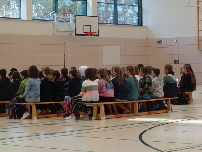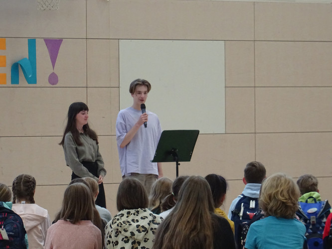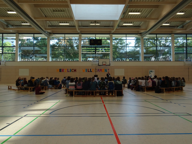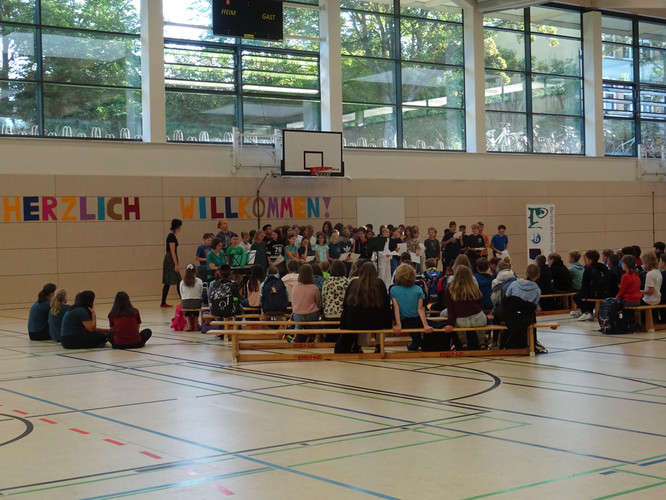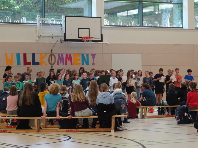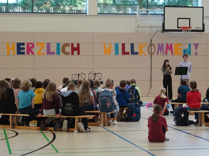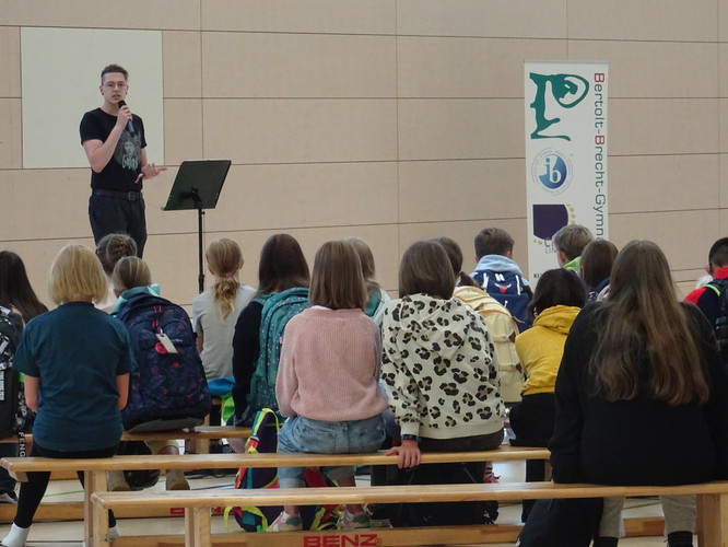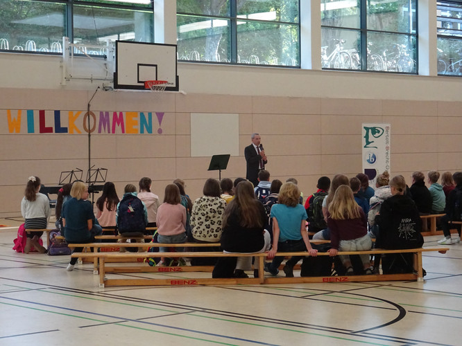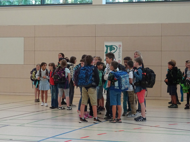 Am 29. August starteten unsere neuen 5. Klassen in ihren ersten Tag am Gymnasium. Dazu fand ein Begrüßungsfestakt in der Sporthalle statt. Schulleiter Herr Meschke hieß die Fünftklässlerinnen und Fünftklässler als erster am Bertolt-Brecht-Gymnasium willkommen. Lennart Scharfe, ein Abiturient des Jahrgangs 2022, sprach den „Neuen“ in ihrer Begrüßungsrede Mut zu und weckte die Neugier auf die kommenden acht Jahre. Auch die amtierenden Schülersprecher Jasmin und Lukas wandten sich an die nun Jüngsten des BeBe, sagten ihre Unterstützung zu und luden sie zur aktiven Mitgestaltung des Schullebens ein, gefolgt vom Team der Schulsozialarbeit. Umrahmt wurden die Ansprachen von musikalischen Beiträgen (Chor der 6. Klassen, die im letzten Jahr an derselben Stelle saßen; Ellen Halim, Klasse 8/1 an der Violine) und einem Auftritt der Theater-AG. Zu guter Letzt folgte – unter den Augen vieler interessierter Eltern – die mit Spannung erwartete Zuteilung in die einzelnen Klassen, die von den Klassenlehrerinnen verkündet wurde.