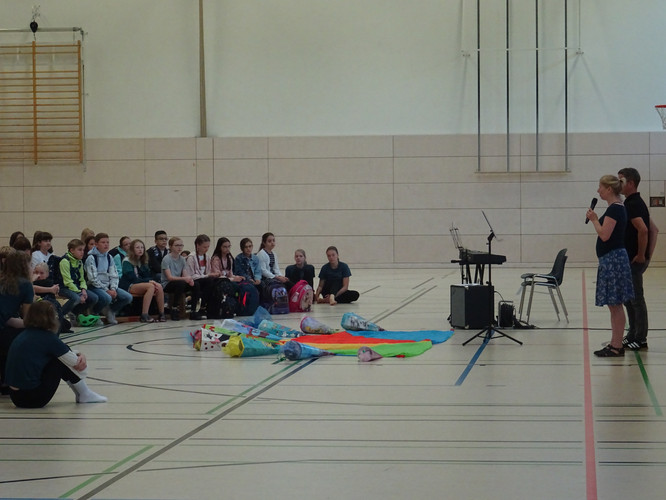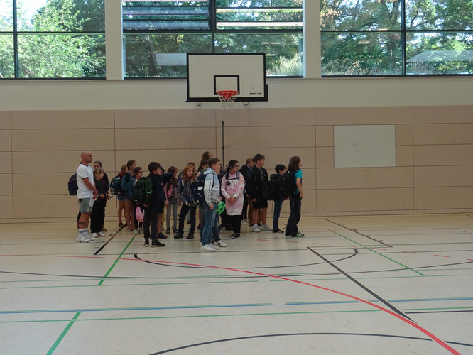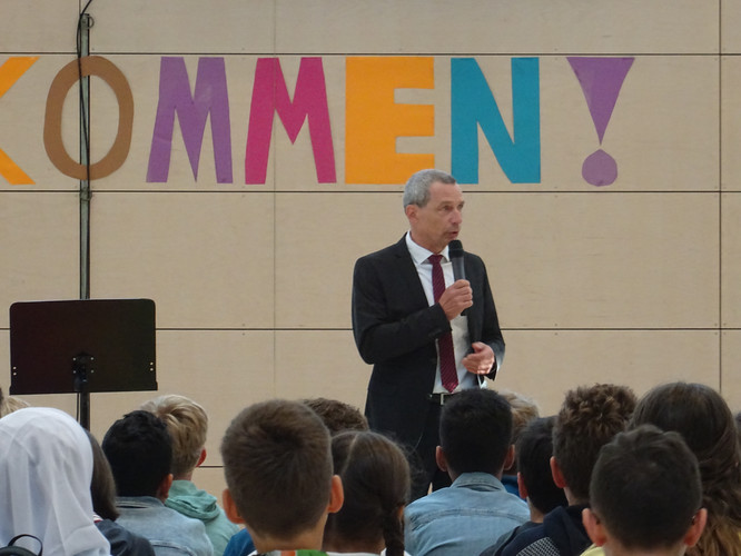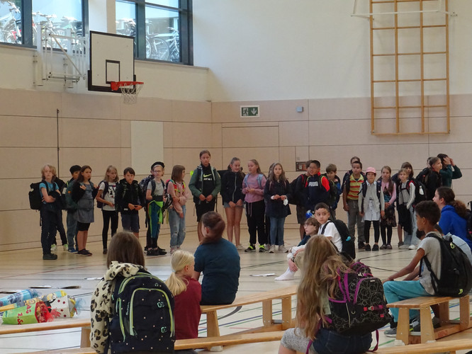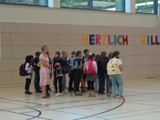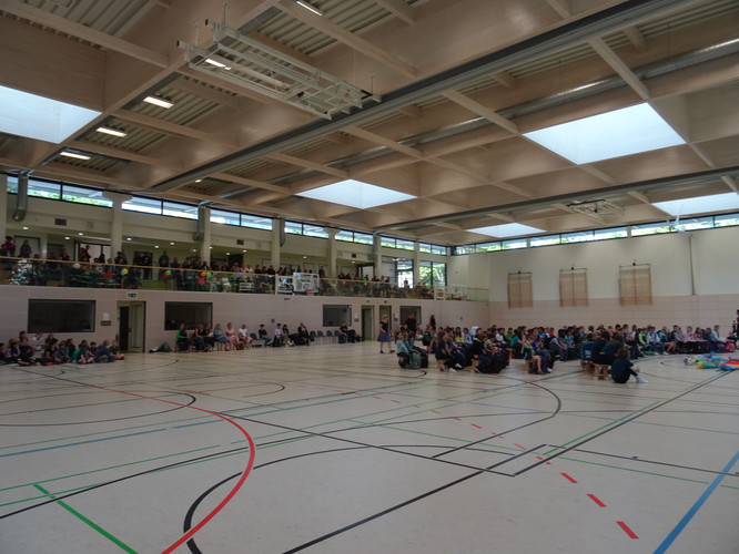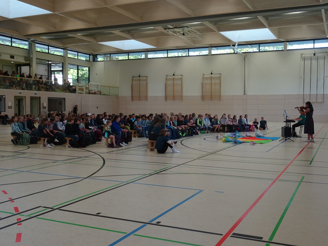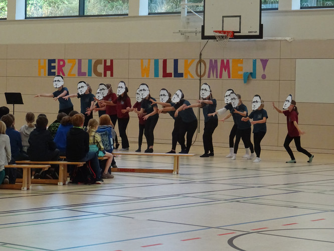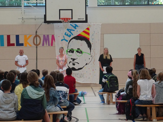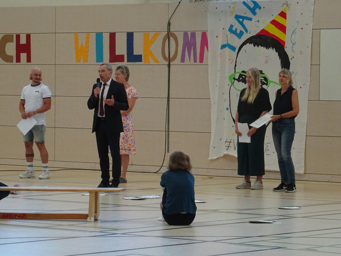Am 29. August starteten unsere neuen 5. Klassen in ihren ersten Tag am Gymnasium. Dazu fand ein Begrüßungsfestakt in der Sporthalle statt. Schulleiter Herr Meschke hieß die Fünftklässlerinnen und Fünftklässler als erster am Bertolt-Brecht-Gymnasium willkommen. Lennart Scharfe, ein Abiturient des Jahrgangs 2022, sprach den „Neuen“ in ihrer Begrüßungsrede Mut zu und weckte die Neugier auf die kommenden acht Jahre. Auch die amtierenden Schülersprecher Jasmin und Lukas wandten sich an die nun Jüngsten des BeBe, sagten ihre Unterstützung zu und luden sie zur aktiven Mitgestaltung des Schullebens ein, gefolgt vom Team der Schulsozialarbeit. Umrahmt wurden die Ansprachen von musikalischen Beiträgen (Chor der 6. Klassen, die im letzten Jahr an derselben Stelle saßen; Ellen Halim, Klasse 8/1 an der Violine) und einem Auftritt der Theater-AG. Zu guter Letzt folgte – unter den Augen vieler interessierter Eltern – die mit Spannung erwartete Zuteilung in die einzelnen Klassen, die von den Klassenlehrerinnen verkündet wurde.
