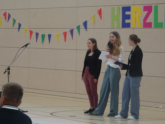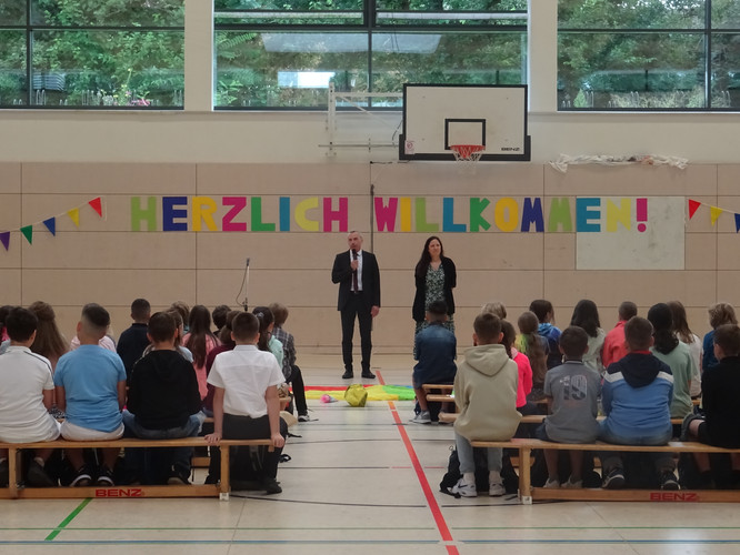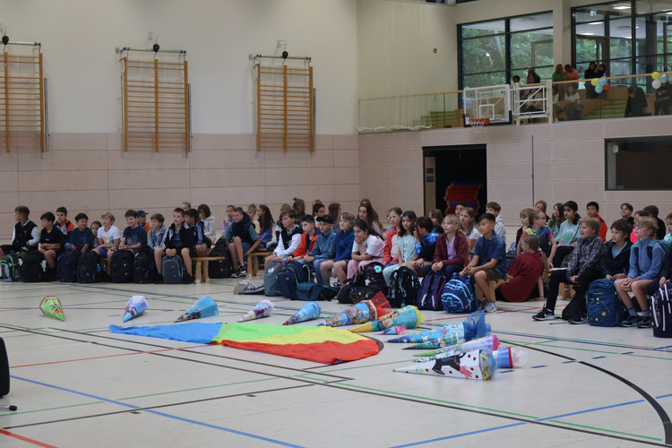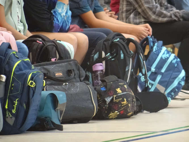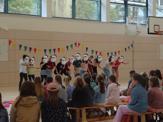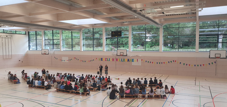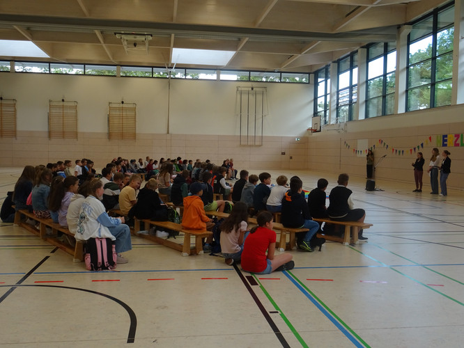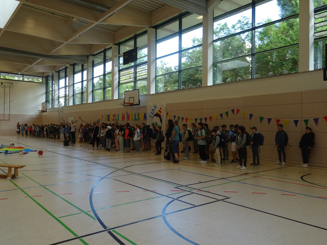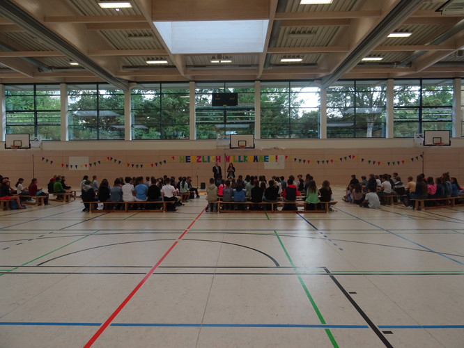 Am 5. August starteten unsere neuen 5. Klassen in ihren ersten Tag am Gymnasium. Dazu fand ein Begrüßungsfestakt in der Sporthalle statt – moderiert von unserer Orientierungsstufenkoordinatorin Frau Jäckel. Schulleiter Herr Meschke hieß die Fünftklässlerinnen und Fünftklässler als Erster am Bertolt-Brecht-Gymnasium willkommen und motivierte gleich zu Beginn u.a. mit der Aussicht auf einen schönen Schulneubau in drei Jahren. Heleni Jäger, Linda Loose und Emma Wattebled aus der Jahrgangsstufe 12 sprachen den „Neuen“ in ihrer Begrüßungsrede Mut zu und weckten die Neugier auf die kommenden acht Jahre. Auch das Team der Schulsozialarbeit sagte kurz „Hallo“ und kündigte seinen Besuch in der ersten Schulwoche an. Umrahmt wurden die Ansprachen von einem musikalischen Beitrag von Anna Rautenberg und Helene Tischer aus der Klasse 6/1 und einem Auftritt der Theater-AG. Zu guter Letzt folgte – unter den Augen vieler interessierter Eltern – die mit Spannung erwartete Zuteilung in die einzelnen Klassen, die von den Klassenlehrerinnen und -lehrern verkündet wurde. Auch die stellvertretenden Klassenlehrerinnen waren anwesend und nahmen die Neuankömmlinge in Empfang. Nach einem Abschiedswinken ging es gemeinsam zu Fuß an den Auslagerungsstandort, wo der erste Tag mit vielen Informationen, aber auch dem gegenseitigen Kennenlernen und dem Erkunden des Schulgeländes begann.