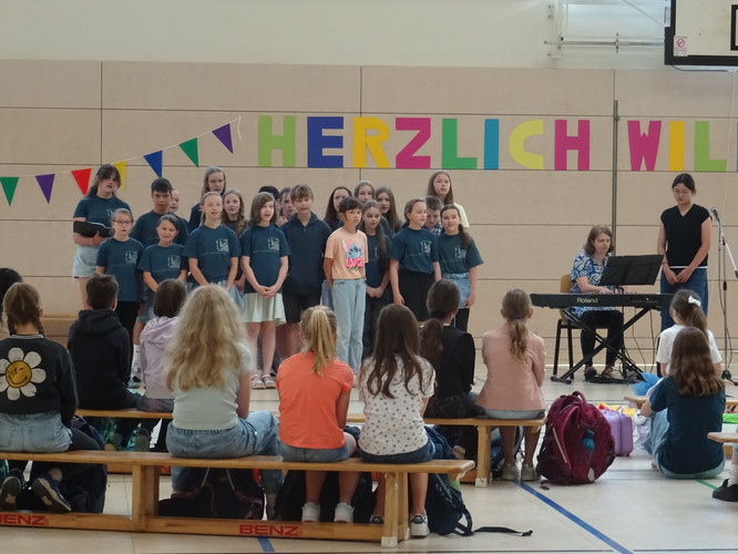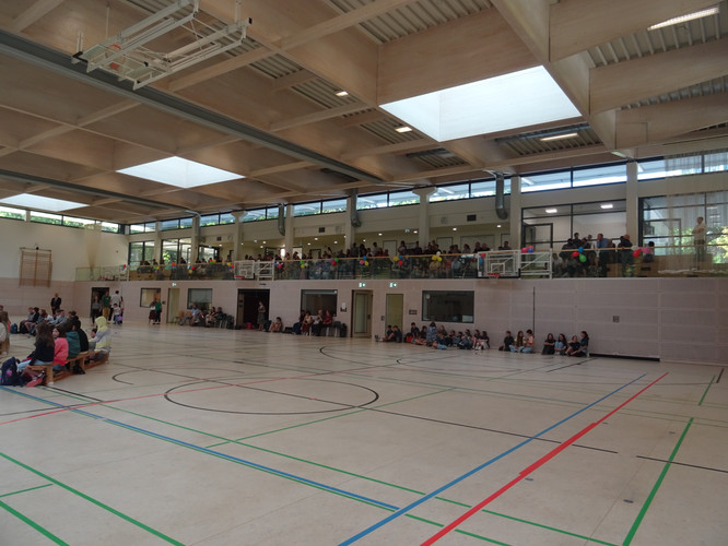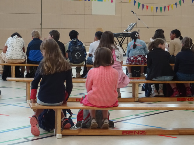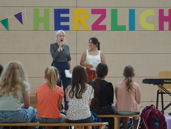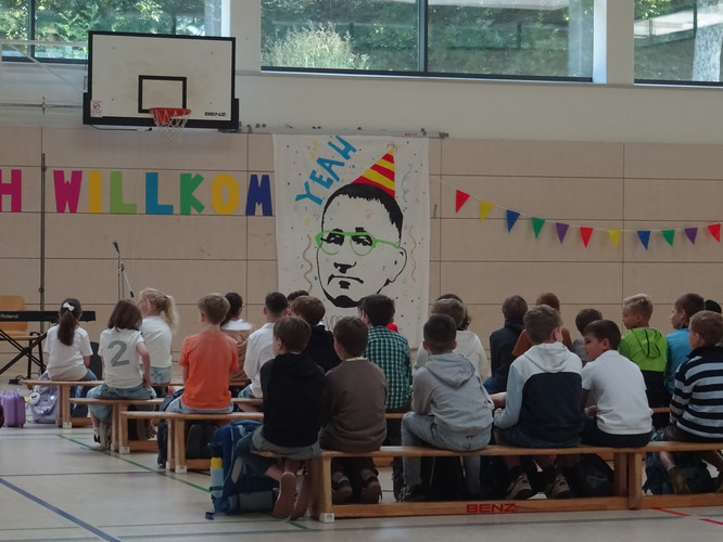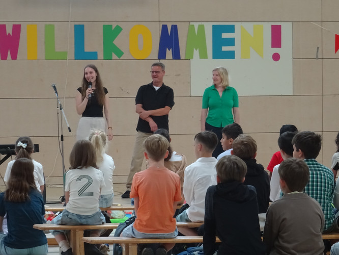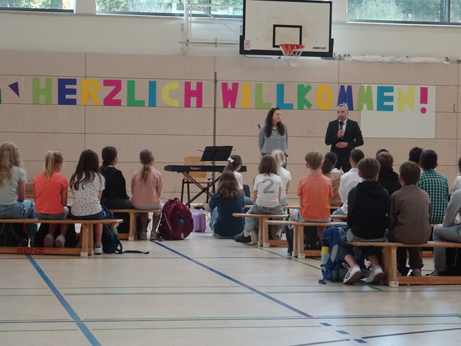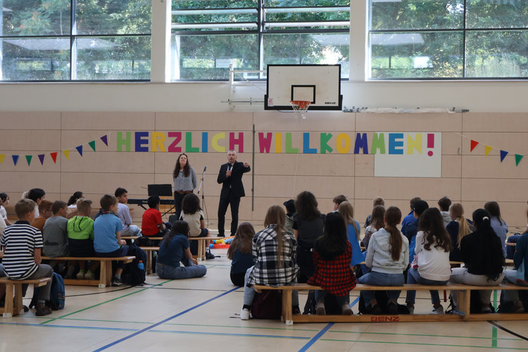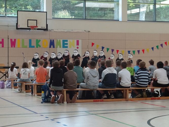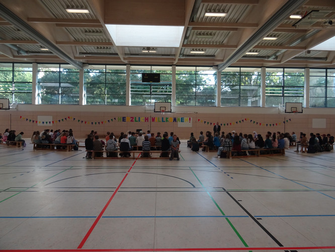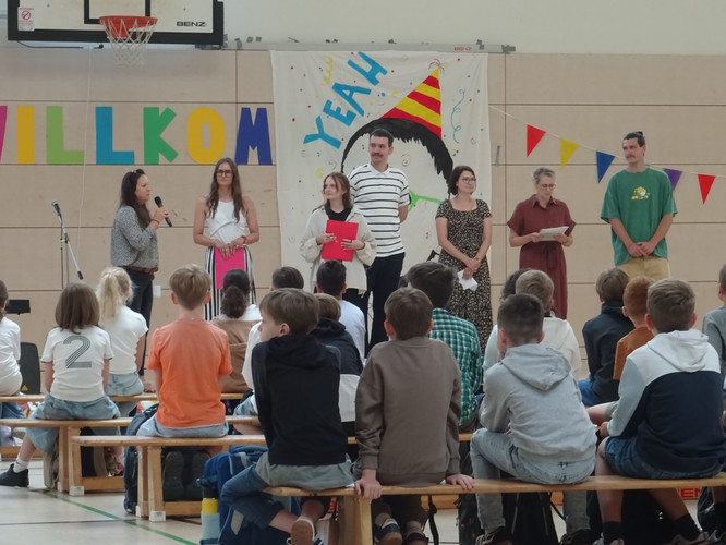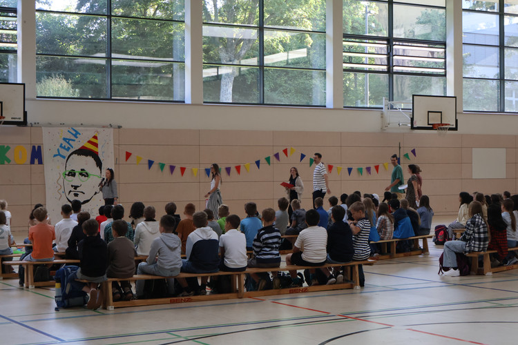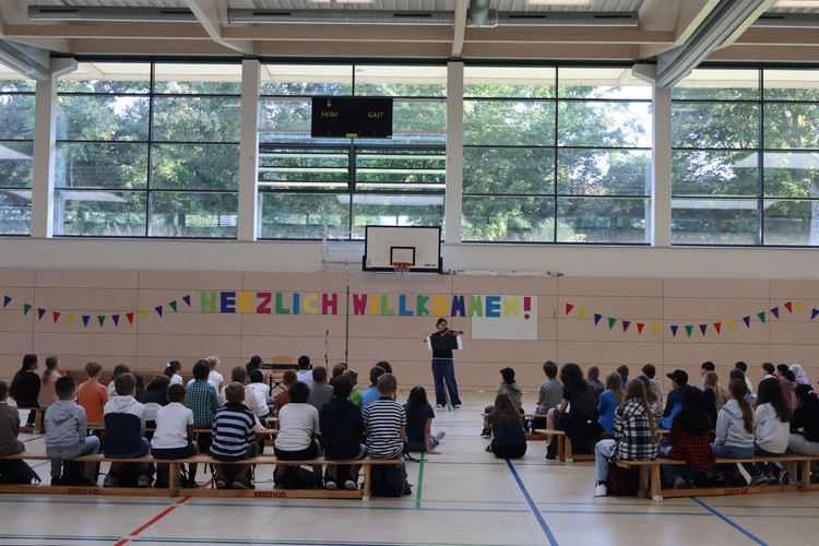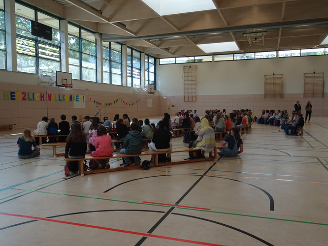 Am 11. August starteten unsere neuen 5. Klassen in ihren ersten Tag am Gymnasium. Dazu fand ein Begrüßungsfestakt in der Sporthalle statt – moderiert von unserer Orientierungsstufenkoordinatorin Frau Jäckel. Schulleiter Herr Meschke hieß die Fünftklässlerinnen und Fünftklässler als Erster am Bertolt-Brecht-Gymnasium willkommen, testete kurz die Sprachkenntnisse in Englisch, Französisch und Russisch und wies auf die offensichtlichsten Veränderungen im Vergleich zur Grundschule hin. Magdalena Auer (Abiturientin des Jahrgangs 2025) und Iraia Krause Solorzano (Jgst. 12) sprachen den „Neuen“ in ihrer Begrüßungsrede Mut zu und weckten die Neugier auf die kommenden acht Jahre. Auch das Team der Schulsozialarbeit sagte kurz „Hallo“ und kündigte seinen Besuch in der ersten Schulwoche an. Umrahmt wurden die Ansprachen von musikalischen Beiträgen des Nachwuchschores und Ellen Halim (Jgst. 11) auf der Violine sowie einem Auftritt der Theater-AG. Zu guter Letzt folgte – unter den Augen vieler interessierter Eltern – die mit Spannung erwartete Zuteilung in die einzelnen Klassen, die von den Klassenlehrerinnen und -lehrern verkündet wurde. Auch die stellvertretenden Klassenlehrerinnen und Klassenlehrer waren anwesend und nahmen die Neuankömmlinge in Empfang. Nach einem Abschiedswinken ging es gemeinsam zu Fuß an den Auslagerungsstandort am Terrassenufer, wo der erste Tag mit vielen Informationen, aber auch dem gegenseitigen Kennenlernen und dem Erkunden des Schulgeländes begann.