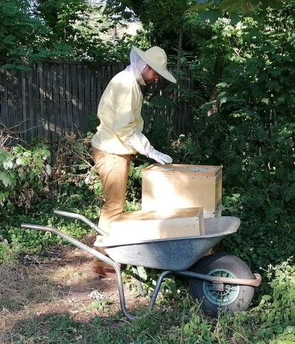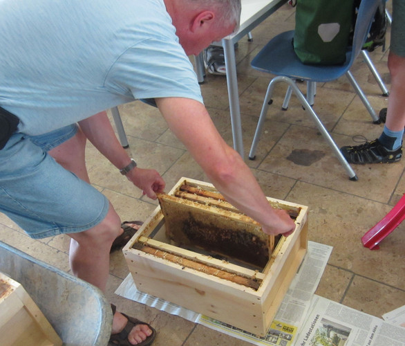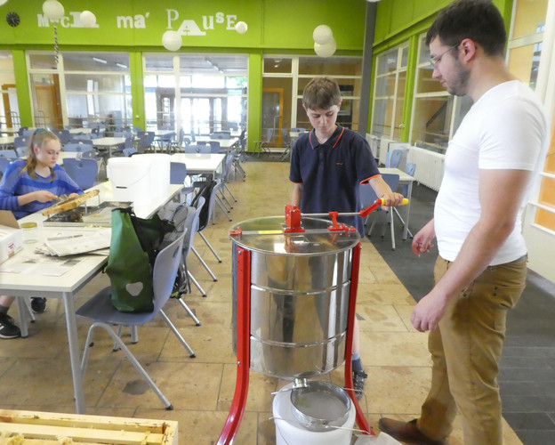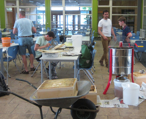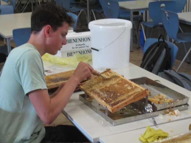 Die AG "Schulimkerei" besitzt vier Bienenkästen, welche hinter der Turnhalle ihren Platz haben. Das Equipment lagert im Schuppen neben dem Schulgarten. Im Winter stand uns zusätzlich ein Raum zur Verfügung, in dem sonst immer T/C stattfindet. Das war ziemlich praktisch, denn in der kalten Jahreszeit beschäftigen wir uns mit Theorie und dem handwerklichen Vorbereiten der Rähmchen, an welche die Bienen dann ihre Waben bauen. Nach der kalten Jahreszeit begannen wir dann damit, wöchentlich in die Kästen zu schauen, bis Herr Junker Mitte Juni die Honigschleuder aus dem Schuppen holte, wir sie in der Cafeteria aufbauten und zwei sehr große, sehr volle Plastikeimer Honig erschleuderten.