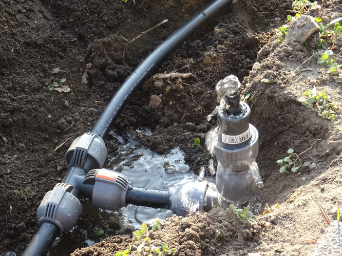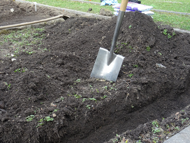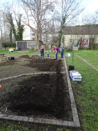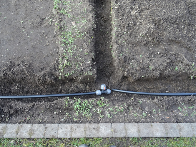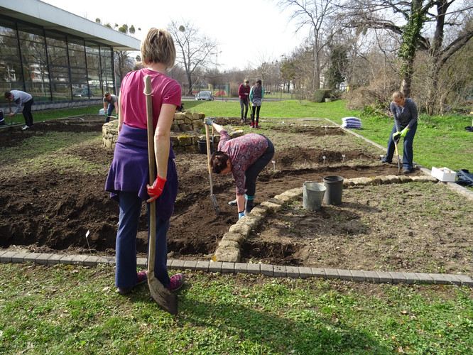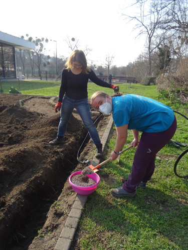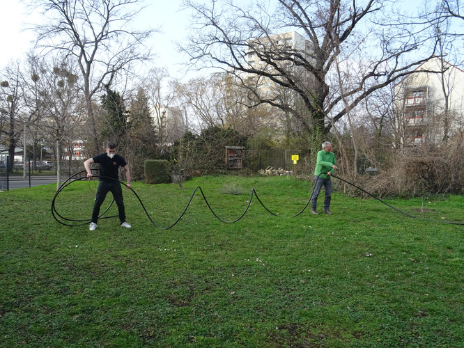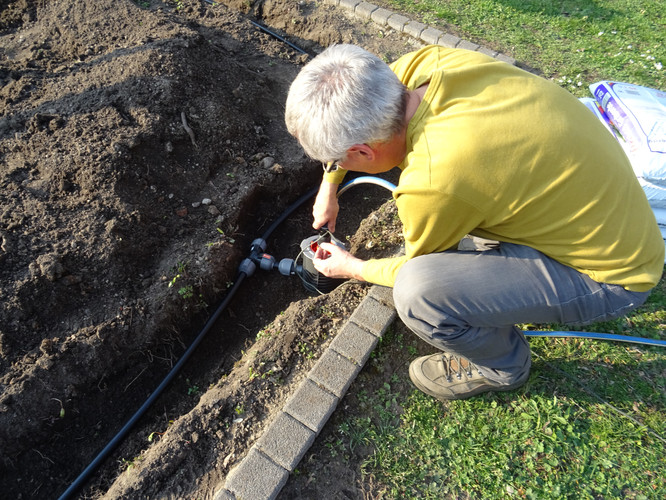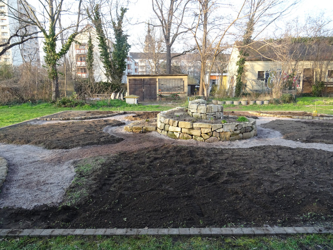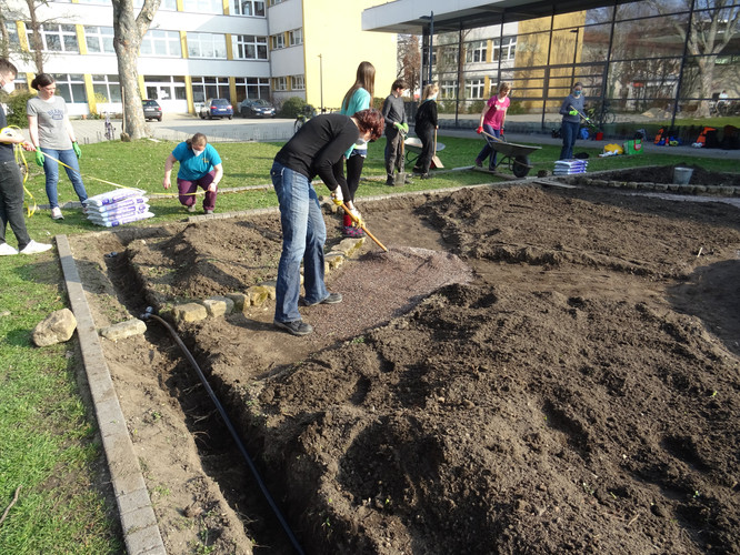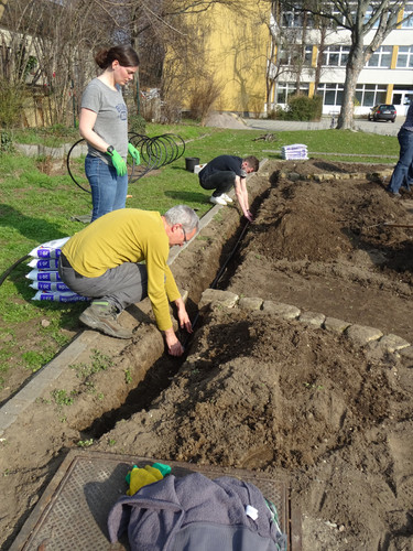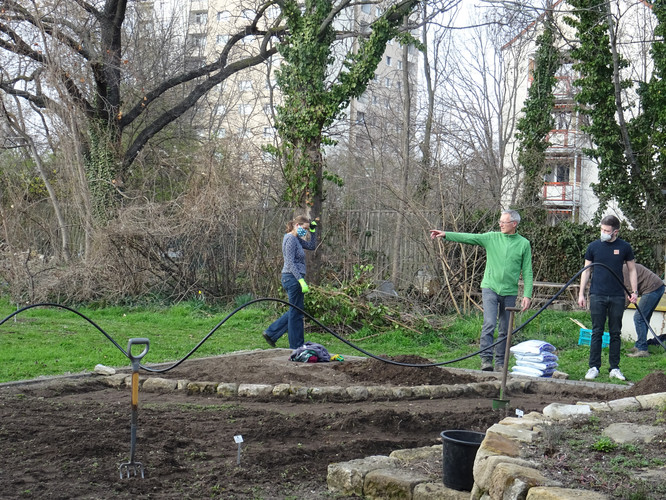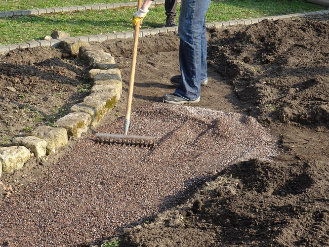 Unsere Ziele für den ersten Tag waren das Einbringen des Bewässerungssystems und das Anlegen von Wegen, damit die Kräuterspirale und die Themenbeete in Zukunft betreten werden können. In kleinen Teams wurden Gräben für die Wasserleitungen ausgehoben sowie die Wege angelegt, wobei hier nur eine dünne Bodenschicht abgetragen wurde. Knifflig wurde es beim Verlegen der Rohre, denn hier war Maßarbeit gefragt: Das noch widerspenstige Rohr musste zugeschnitten und mit Hilfe eines Stecksystems aus zahlreichen Adaptern verbunden werden. Nach einem ersten Probelauf und dem Nachbessern an undichten Stellen lief das Wasser, wohin es sollte. Schnell waren im Anschluss die Gräben aufgefüllt und die Kiesschicht auf die Wege verteilt. Erstes Ziel geschafft! Mit Stolz und Freude betrachteten wir unser Ergebnis, auch wenn es am Ende natürlich länger gedauert hat als geplant.