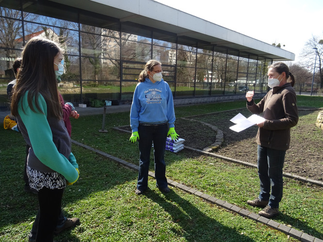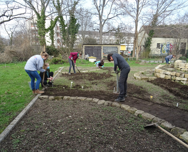 Es war eine der letzten gemeinsamen Aktionen vor der Schulschließung im Dezember, – an einem sonnigen Novembertag – als eine Gruppe aus Schülerinnen und Schülern sowie Lehrerinnen und Lehrern und dem Unkraut- und Grasbewuchs rund um die Kräuterspirale zu Leibe rückte. Nun, nachdem mit Beginn des Wechselunterrichts mit allen Klassenstufen zumindest ein Stück Schulalltag zurückgekehrt ist, wagten wir uns auch wieder an die Fortsetzung unserer BNE-Projekte. An zwei Tagen gab es auf der Fläche neben der Sporthalle erneut einiges zu tun.