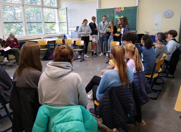 Zu unserem Projekttag am 13.10.20 haben wir uns mit dem Film „También la lluvia“ (dt. „Und dann der Regen“) beschäftigt und León und Gloria, die für den Verein „Move it young“ arbeiten, aber eigentlich aus Kolumbien stammen, haben uns viele interessante Dinge zum Film und zum Thema Wasser erzählt. Natürlich auf Spanisch! In Kleingruppen haben wir, die Spanisch-Schüler der 10. Klassen und des GK 12, uns mit verschiedenen Fragen zum Thema beschäftigt: Ist es richtig, dass der Zugang zu sauberem Trinkwasser privatisiert werden darf? Welche Rechte haben die indigenen Bewohner in Bolivien? Denn vor allem sie gingen im Jahr 2000 auf die Straße und demonstrierten für ihr Recht, eigene Brunnen und Regenwasserzisternen zu betreiben, weil sie nicht in der Lage waren, die überteuerten Preise von Aguas del Tunari zu bezahlen. Leider eskalierte die Situation in Cochabamba und es kam zu gewaltsamen Auseinandersetzungen, bei denen auch mehrere Menschen starben. Letztlich konnten die indígenas aber den Wasserkrieg für sich entscheiden und die bolivianische Regierung nahm den Verkauf der Wasserversorgung an den privaten Konzern Aguas del Tunari zurück.