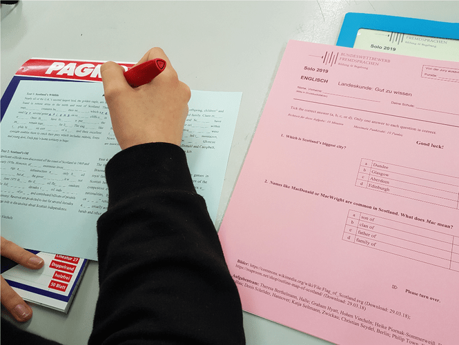 Sieben Schülerinnen hatten Englisch als Wettbewerbssprache gewählt und beschäftigten sich zum Thema Schottland mit Aufgaben in den Bereichen Lese- und Hörverstehen, Landeskunde und kreativem Schreiben, eine Schülerin bearbeitete Aufgaben in Französisch. Hier war das diesjährige Schwerpunktthema die Normandie.