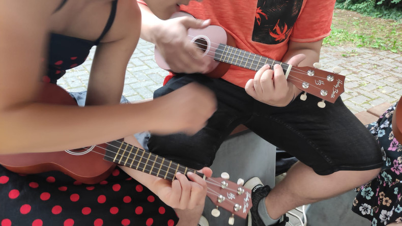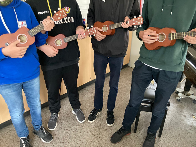 Das Bertolt-Brecht-Gymnasium hat - gefördert durch den Stadtteilfonds Johannstadt - aus Mitteln des Stadtbezirksbeirats Altstadt Cajons und Ukulelen erhalten. Zum Ende des Schuljahres 2021/2022 sind sie bei uns eingetroffen. Während unseres Schulfestes kamen die Ukulelen gleich tatkräftig bei einem Ukulelenworkshop zum Einsatz.