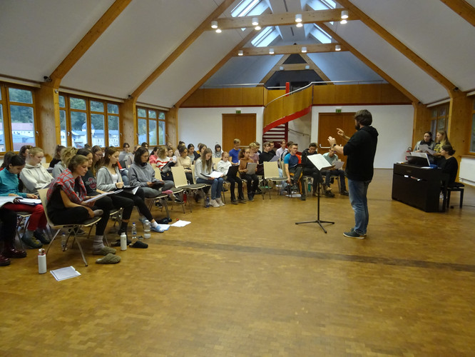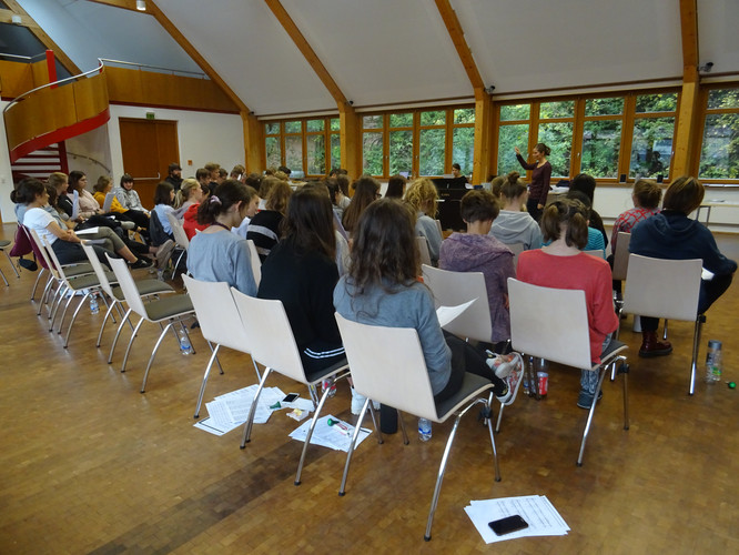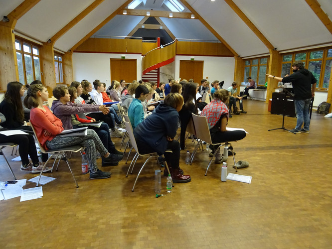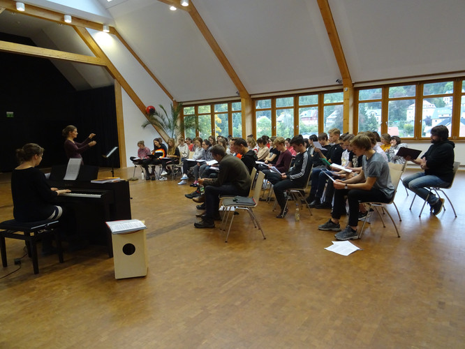 Wie ein Vorbote leuchtet die Pyramide unweit des Martin-Luther-King-Hauses in Schmiedeberg und lässt die Weihnachtszeit schon erahnen. Genau dahin zog es unseren Schulchor in diesem Jahr wieder: in den hohen, hellen, lichtdurchfluteten Probenraum des „King´s“. Dass das Chorlager diesmal noch vor den Herbstferien stattfand, schien dabei niemanden zu stören. Und so klang und tönte es bald von Türen und Toren, die sich öffnen sollen, vom kleinen Jesuskind und seiner Mutter Maria, von grünen Tannenzweigen, von Freude und Licht. Nach dem ersten Probentag in Teil- und Gesamtproben – geleitet von Frau Folprecht, Frau Sitzlack und Herrn Ferencz – waren schnell die ersten Teilerfolge zu hören. Ein dichter Probenplan zeugte vom Anspruch unserer Chorleiter. Der Beginn der Probenzeit um 9:15 Uhr – von manch Zuhausegebliebenem sicher neidisch beäugt – täuschte: Die Schüler und Chorleiter absolvierten gemeinsam Probentage bis weit in die Abendstunden hinein. Da durften bequeme Sachen, warme Socken, Halsbonbons und Wasserflaschen auf keinen Fall fehlen.