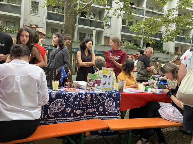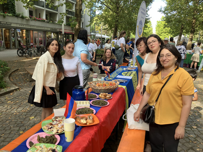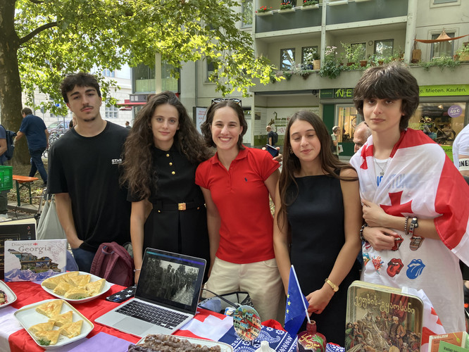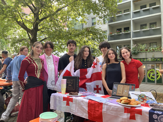 In diesem Jahr nahm unsere Schule zum ersten Mal an der Veranstaltung „Dresden isst bunt“ am 01. September auf der Hauptstraße teil. Wir hatten uns im Rahmen des PAD-Stipendienprogrammes „Deutschland Plus“ mit unseren zwölf teilnehmenden Gästen und Gastfamilien angemeldet und konnten zwei Tische mit Naschereien aus Georgien und Armenien sowie vielen Informationen zu den beiden Ländern und unserer Schule präsentieren. Die Stimmung war gut, das Wetter prächtig und zahlreiche Gäste zeigten großes Interesse an unseren Themen. Die Möglichkeit, die vielfältigen Aktivitäten und die internationale Ausrichtung des BeBe, aber auch unsere gegenwärtige räumliche Situation, in der wir alles realisieren, vorzustellen, stieß bei ihnen auf reges Interesse. Unsere Gastschüler fanden viele Gelegenheiten zu Gesprächen und trainierten so ihr ohnehin sehr gutes Deutsch. Sie waren begeistert dabei. Verschiedene Kolleginnen des BeBe, Frau Sontheimer, Frau Aradei-Odenkirchen, Frau Illhardt, Frau Bachmann und Frau Große, fungierten zusammen mit den begleitenden Lehrkräften, Frau Daraselia aus Georgien und Frau Simonjan aus Armenien, als Ansprechpartner vor Ort und konnten ebenfalls als Botschafterinnen unserer Schule informieren. Die Veranstaltung war in aller Augen ein Erfolg und die erneute Teilnahme im nächsten Jahr ist beabsichtigt.