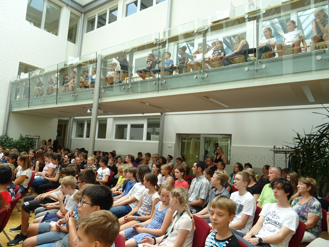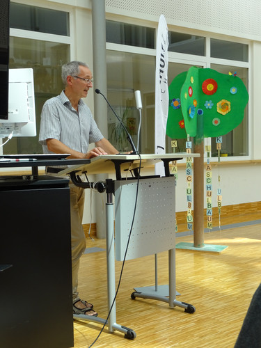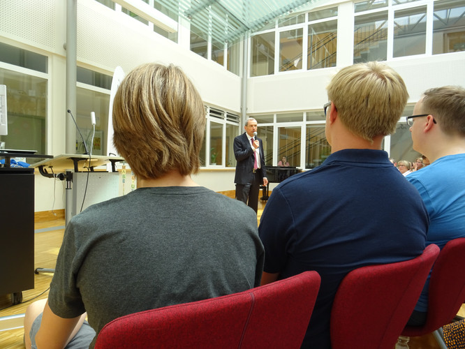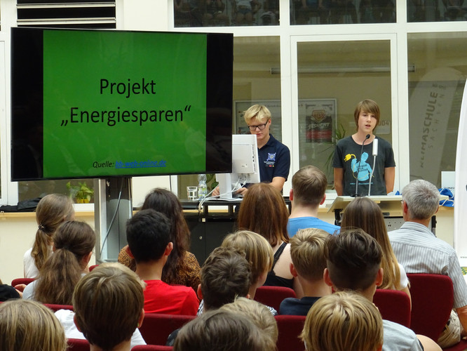 Angesichts der Temperaturen in der Aula wird sich manch einer nach den (fehlenden) Klimaanlagen in sächsischen Schulen, die Herr Meschke in seiner Begrüßung erwähnte, gesehnt haben. Das Thema Wärme und das langjährige Bemühen um Ressourcenschonung und Kosteneinsparung prägte den Weg des BeBe zur Klimaschule - anschaulich und sympathisch vermittelt durch David (10/1) und Jonny (10/3) - entscheidend. Darüber hinaus wurde aber auch deutlich, dass dem Themenfeld Nachhaltige Entwicklung bereits weitere Aspekte abgewonnen und in Projekte umgesetzt wurden.