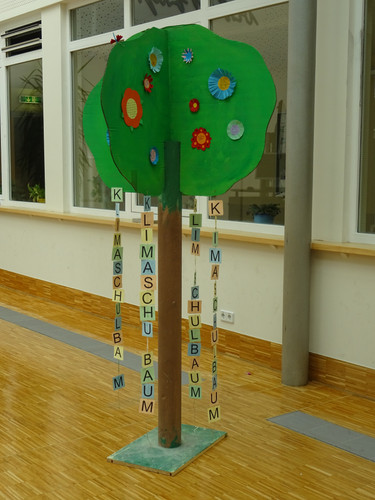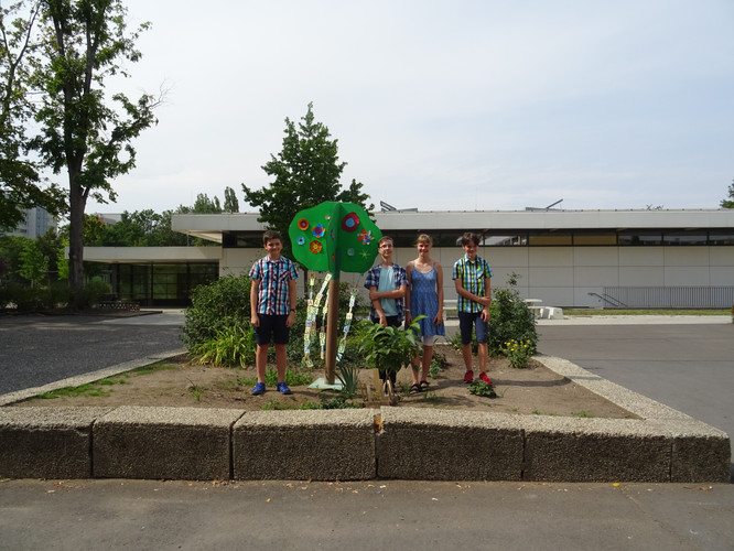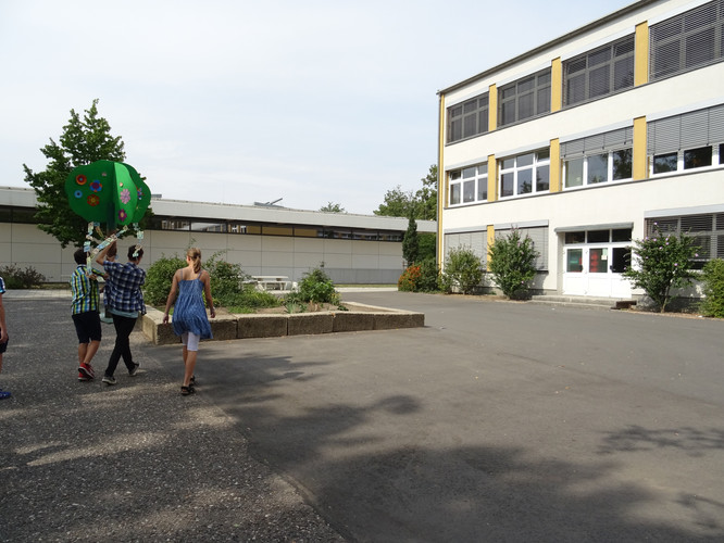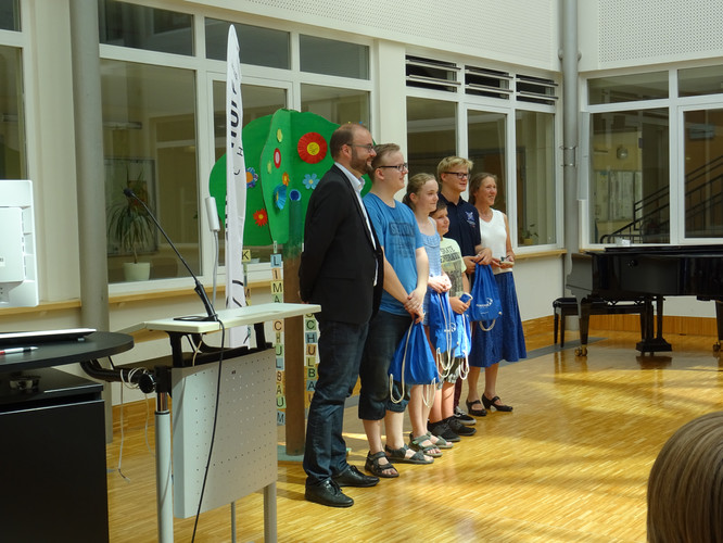 Emotionaler Höhepunkt war das Aufstellen des symbolischen Klimaschulbaums, der schon den ganzen Tag ein Blickfang in der Aula war. Im Herbst soll an dieser Stelle auf dem Schulhof eine Blumenesche gepflanzt werden.