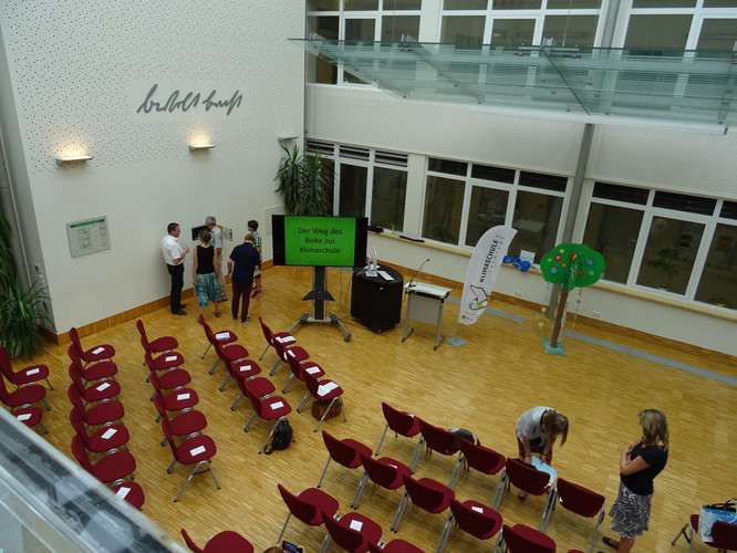 Trotz hochsommerlicher Temperaturen, aufgeheizter Unterrichtsräume und Hitzeplan fanden sich am 29.08.2019 viele Schüler, Lehrer und Eltern in der Aula des Bertolt-Brecht-Gymnasiums ein, um die Verleihung des Titels "Klimaschule" mitzuerleben. Das BeBe ist nun die 12. Klimaschule Sachsens. Dieser Titel würdigt die langjährige Arbeit unserer Schülerfirma "bb-web" sowie die Projekte der seit Februar 2019 bestehenden Arbeitsgruppe BNE (Bildung für Nachhaltige Entwicklung) auf dem Gebiet des Umwelt- und Klimaschutzes. Gleichzeitig steht er für die Verpflichtung, dem Thema innerhalb der Schule weiterhin hohe Aufmerksamkeit einzuräumen.