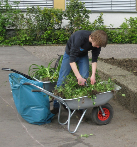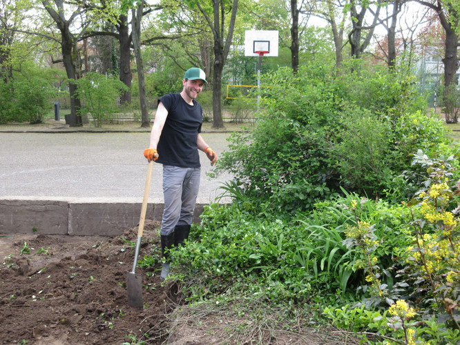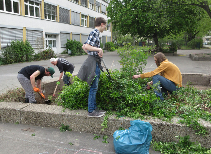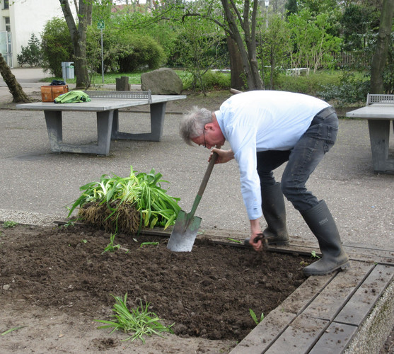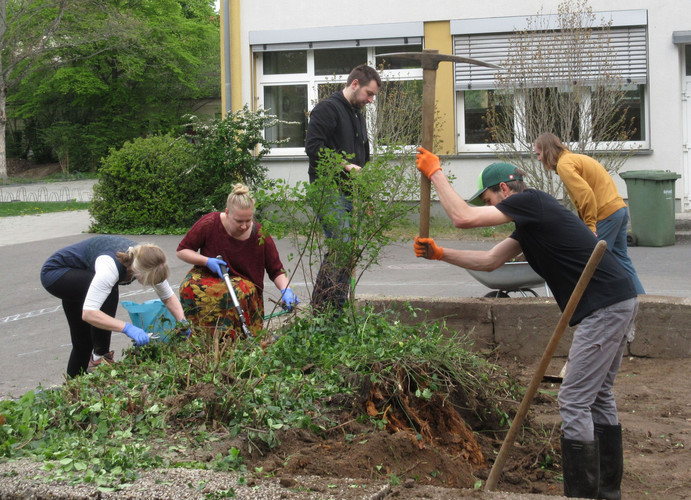 Wir beauftragten eine Firma mit der Anwuchspflege, doch leider ging der erste Baum ein. Die Firma startete einen zweiten Versuch, aber auch dieser blieb erfolglos. In diesem Frühjahr nahmen wir die Sache nun selbst in die Hand. Frau Klemm und Herr Junge planten die Pflanzaktion und stemmten auch den Großteil der aufwändigen Vorarbeiten. In mehreren kleinen Arbeitseinsätzen bereiteten wir dann gemeinsam die Pflanzfläche vor. - Ein großes Dankeschön allen Helferinnen und Helfern! -
