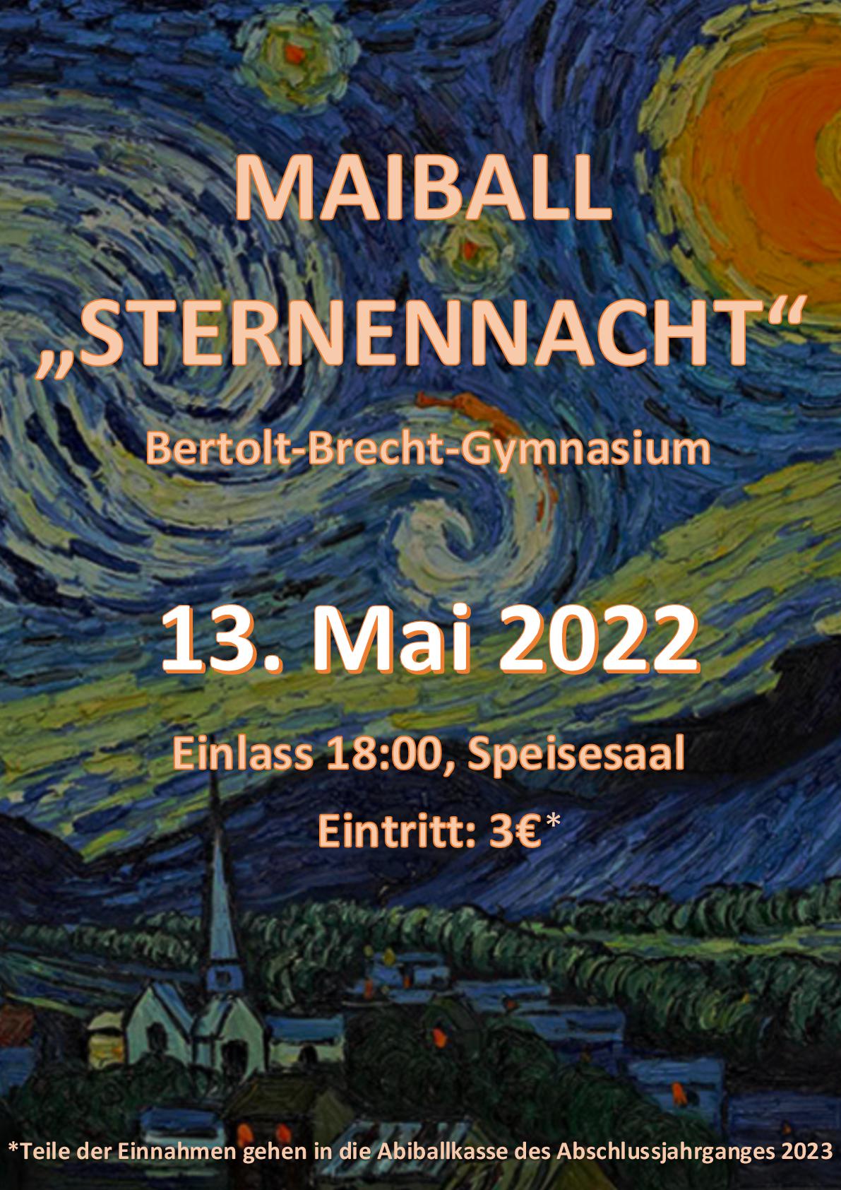 Du hast mal wieder Lust zu tanzen und mit Freunden in der Schule zu feiern? Dann komm zum Maiball am 13. Mai 2022 von 18 - 21.30 Uhr in den Speisesaal des Bertolt-Brecht-Gymnasiums! Karten können am Veranstaltungsabend für 3 EUR pro Person erworben werden.