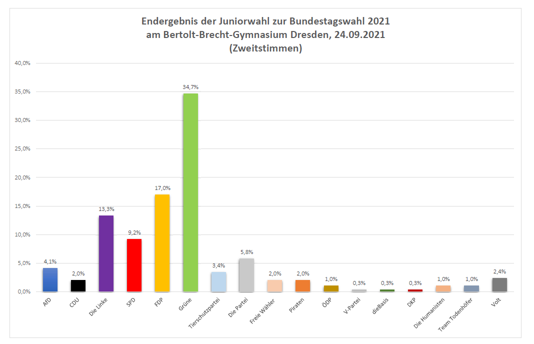 Am Freitag, den 24. September 2021, konnten unsere Schüler und Schülerinnen der Klassen 9 - 12 an der Juniorwahl zur Bundestagswahl teilnehmen. Die Wahlbeteiligung lag bei 58%. Die Auszählung aller gültigen Stimmen ergab folgendes Ergebnis: