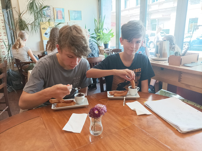 Am Mittwoch, den 28. August 2024, waren wir spanische Churros essen und haben gelernt, wie man Salsa tanzt. 12:35 Uhr war Treffpunkt bei der Schauburg, von dort aus sind wir zu Nibs Cacao" gelaufen und haben Churros gegessen. Die Churros waren wir als 9. Klasse alleine essen. Die Churros waren extrem lecker und nur empfehlenswert. Danach kam aber erst die Hauptaktivität dieses Tages: Der Salsa-Kurs.