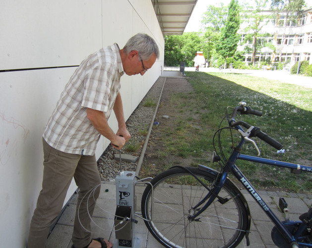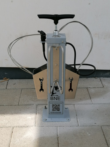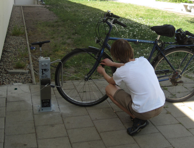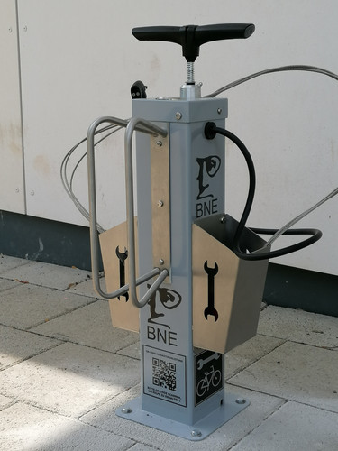 An der Station kann man den Luftdruck der Reifen prüfen und gegebenenfalls nachpumpen. Es gibt auch etwas Werkzeug. Wenn z.B. das Schutzblech klappert, kann man die lockern Schrauben festziehen, bevor man sie verliert.