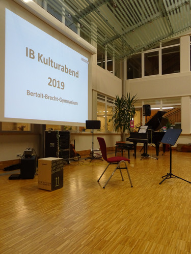 Am Donnerstag, den 14. März 2019, fand um 19 Uhr in der Aula des Bertolt-Brecht-Gymnasiums der diesjährige IB-Kulturabend statt. Er wurde diesmal von IB-Schülern unserer Jahrgangsstufe 11 selbständig organisiert. Schüler des BeBe aus verschiedenen Jahrgangsstufen präsentierten dem Publikum musikalische, tänzerische, bildkünstlerische, multimediale und literarische Beiträge. Der Abend bildete außerdem den Rahmen für zwei IB Music Internal Assessments und die Arts Exhibition, eine Ausstellung von Werken, die im Rahmen von IB Arts entstanden sind. Der Abend selbst sowie ein Imagefilm für unser Gymnasium, der bei dieser Gelegenheit Premiere hatte, sind Ergebnisse von CAS-Projekten.