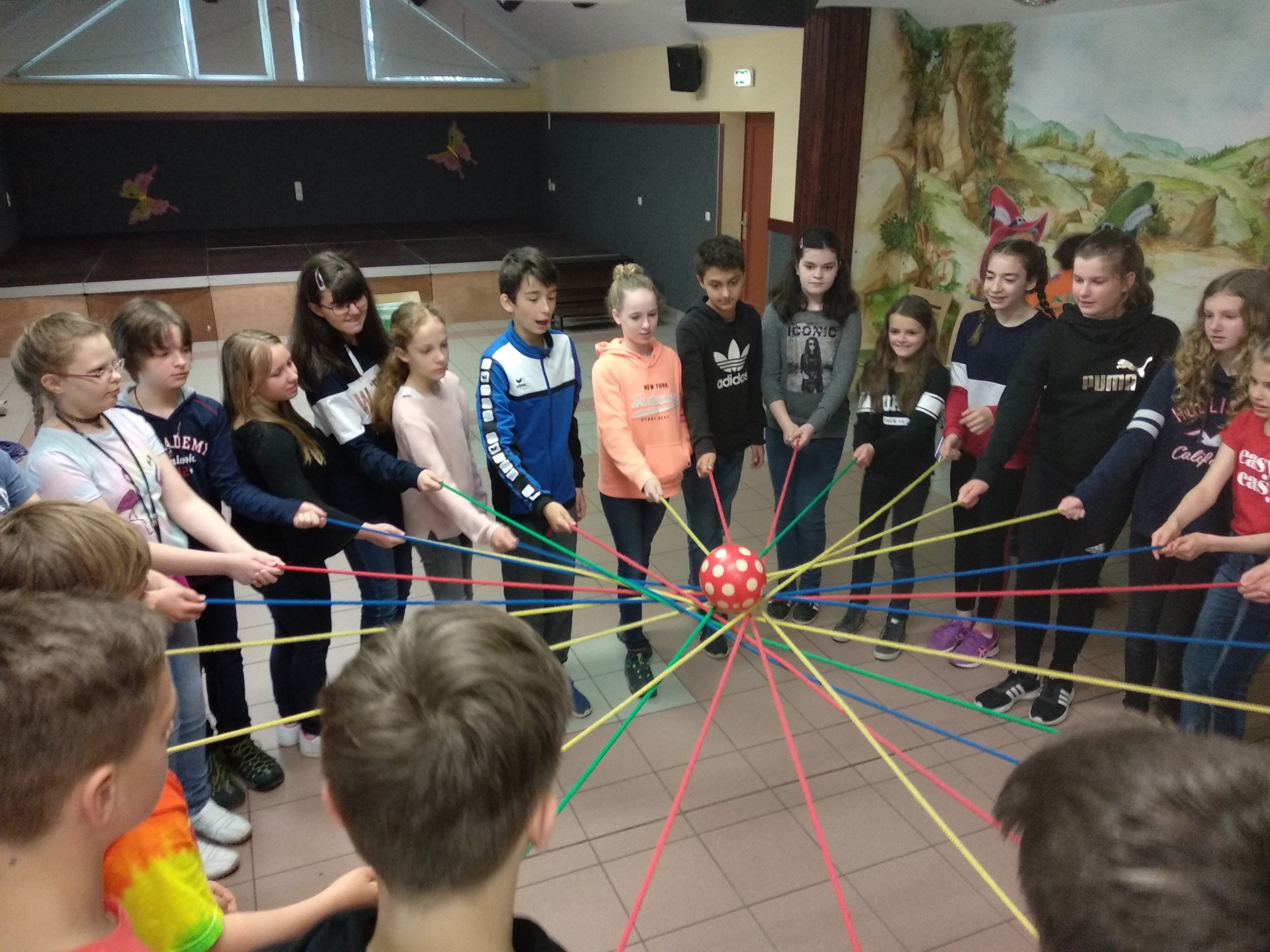 Am nächsten Morgen wurden wir um 7.30 Uhr geweckt. Direkt nach dem Frühstück ging es in ein kleines Haus, wo wir als Klasse verschiedene Teamspiele bewältigen mussten. Zum Beispiel mussten wir einen Ball auf ganz viele Seile, die von uns gehalten wurden, legen und ihn in einen Eimer transportieren, ohne dass er runterfällt. Dabei haben wir gesehen, wie gut unsere Klasse im Team arbeiten kann. Nach dem Mittagessen ging es in die sogenannte „Mind-Arena“. Das ist ein Raum, in dem ganz viele Kisten mit Rätseln stehen, die wir in Gruppen lösen mussten. Frau Bär und Frau Mattheß haben als Zweierteam auch mitgemacht und schlugen das beste Schülerteam knapp um 10 Punkte. Als letztes war der Orientierungslauf dran, bei dem wir ebenfalls in Gruppen mit Kompass und GPS-Gerät in den Wald gingen und Fragen auf unseren Aufgabenblättern beantworten mussten. Leider hat das nicht so gut geklappt, da sich alle Gruppen im Wald getroffen haben und dann zusammen eine komplett falsche Route gelaufen sind. Als wir wieder ankamen, hatten wir nicht besonders viele Fragen beantwortet.
