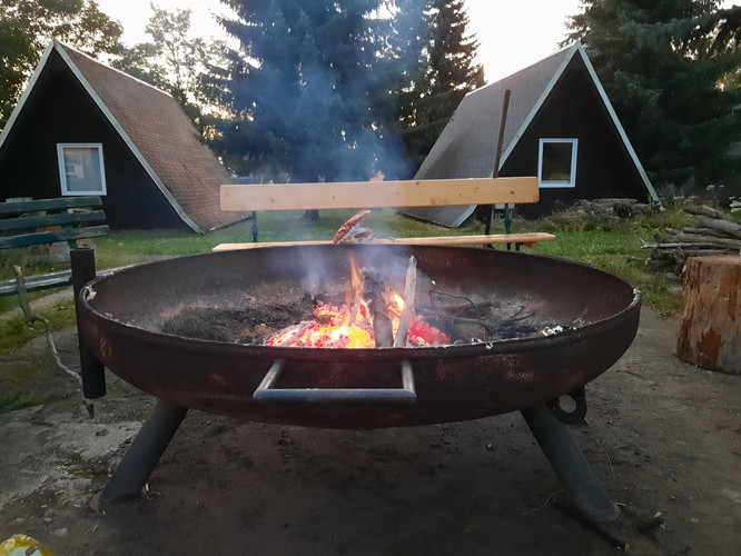 Nach dem Mittagessen wurden die Schlüssel verteilt und jeder hat seine Hütte bezogen. Die Hütten waren sehr gemütlich und belebt. Ja, sie waren belebt. Und zwar von Spinnen, Mücken und anderen Krabbeltieren. Das konnte uns aber nicht die gute Laune verderben! Wir sind einfach nach draußen gegangen. Es gab ein Volleyballfeld, auf dem wir Beach-Volleyball gespielt haben. Außerdem hatte ein Mädchen aus unserer Klasse das Spiel "Werwolf" mit, mit dem wir die Zeit bis zum Abendessen verbracht haben. Als wir fertig mit dem Essen waren, wurden zwei Gruppen gebildet: Einmal die, die Fußball schauen wollten (und solange, wie das Spiel ging, aufbleiben durften), und einmal die, die bis 22 Uhr machen konnten, worauf sie Lust hatten. Die, die machen konnten, was sie wollten, sind rausgegangen und haben Volleyball gespielt. Natürlich bis nach 22 Uhr.