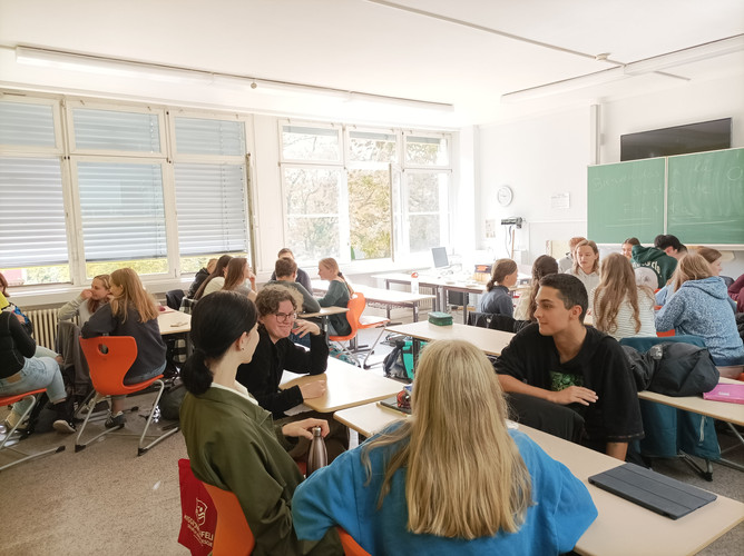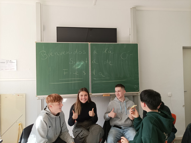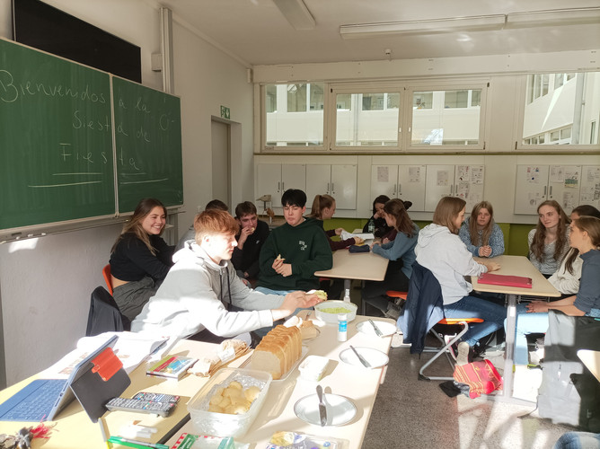 Am 10. Oktober trafen wir uns im Rahmen des Spanischprofils mit Schülern der 12. Jahrgangsstufe, die den Grundkurs Spanisch belegen, zu einer „Siesta de fiesta“. Mit Musik und leckerem Essen verbrachten wir eine erkenntnisreiche Stunde mit den Schülern der Oberstufe. In kleinen Gruppen hatten wir die Möglichkeit, allgemeine Fragen zur Kurswahl und natürlich zum Grundkurs Spanisch zu stellen. Es war toll, sich mit den älteren Schülern auszutauschen, da sie für das nächste Jahr Tipps geben konnten und auch zum Lernen der spanischen Sprache. Es war sehr schön und eine gute Idee.