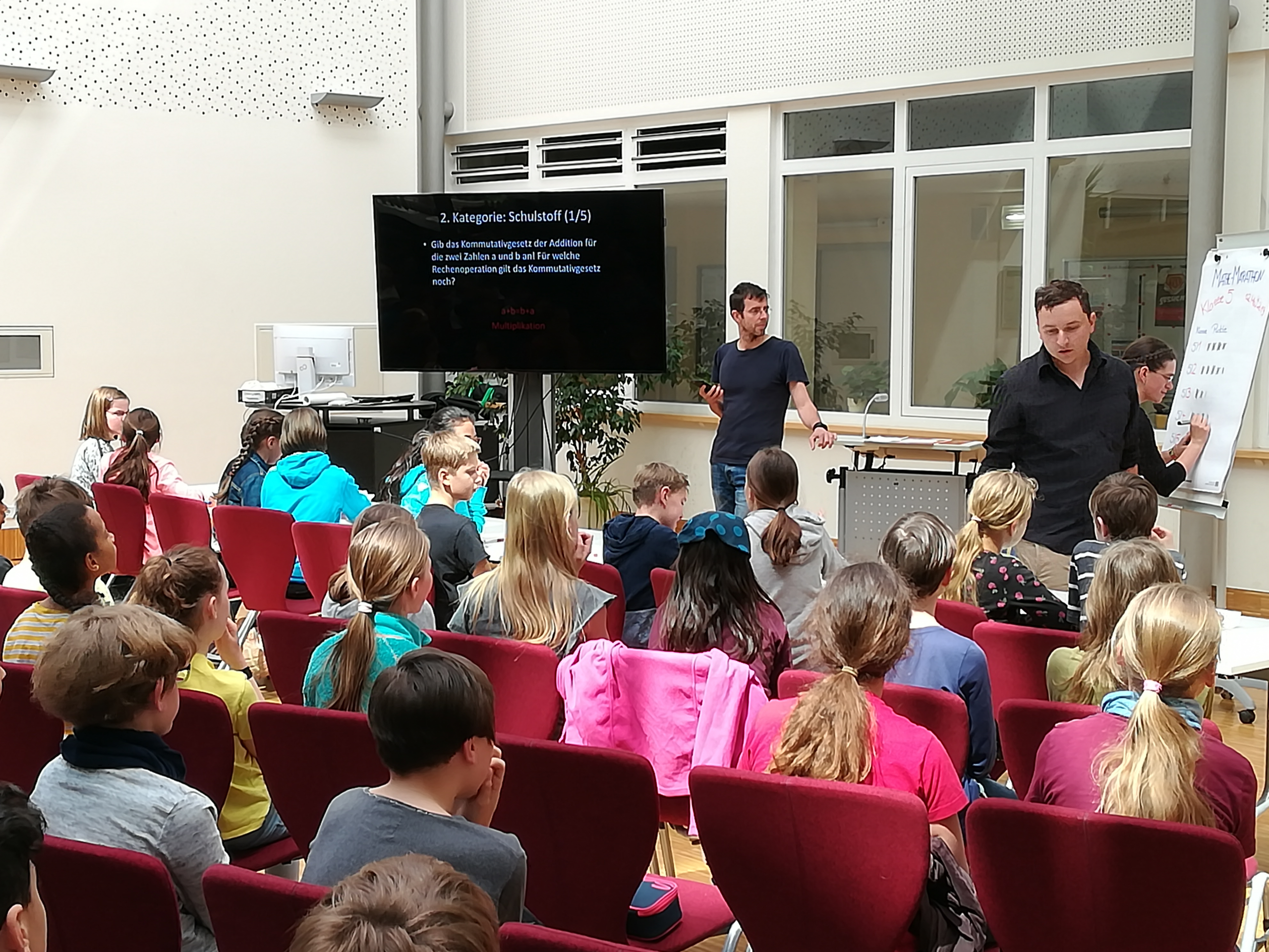 Am Donnerstag, den 2. Mai, fand in der Aula der Abschlusssprint des Marathons statt. Pro Klasse stellten sich insgesamt acht Schüler den Aufgaben in den vier Kategorien Kopfrechnen, Schulstoff, Fermi-Aufgaben und Knobelaufgaben. Jeder erreichte Punkt nach einer richtig gelösten Aufgabe wurde von den Klassen gefeiert. Alle Klassen sammelten so nochmals viele Punkte, am Ende wurde es ein Kopf-an-Kopf-Rennen der Klassen 5/1 und 5/2. Beide Klassen lösten die letzte, entscheidende Aufgabe richtig, so dass sich die 5/2 mit einem Punkt Vorsprung durchsetzen konnte. Die Gewinnerklasse kann nun, dank des Fördervereins unserer Schule, gemeinsam einen Tag im Playport verbringen.