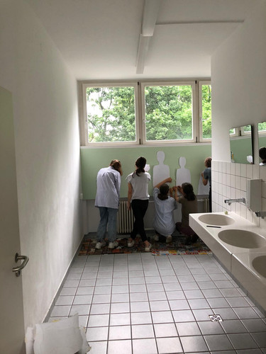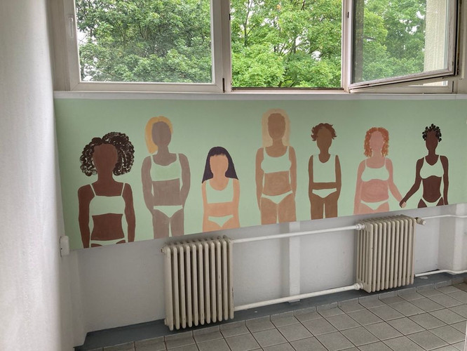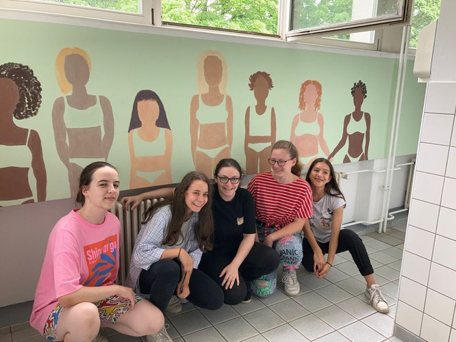 Am Ende der 9. Klasse beschäftigten wir uns im Kunstunterricht mit dem Thema Streetart und bekamen die Möglichkeit, eine Stelle in der Schule künstlerisch zu gestalten. Ob nützlich (z.B. Ausschilderungen) oder einfach nur kreativ, stand jeder Gruppe frei zur Wahl. Wir haben uns dafür entschieden, eine Wand in der Mädchentoilette mit verschiedenen Körpertypen zu bemalen. Damit wollen wir zeigen, dass unabhängig von Herkunft, Sexualität, Geschlechtsidentität und Körperform generell jeder schön und vor allem vollkommen ist. Nach Einverständnis von Herrn Meschke und ausführlicher Planung verwirklichten wir, mit Unterstützung von Frau Schellenberg und Alwines Mutter, unsere Idee am Freitag, dem 16.7.2021, und am Samstag, dem 17.7.2021. Wir hoffen, dass es euch gefällt!