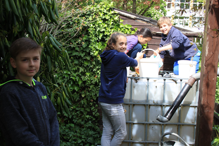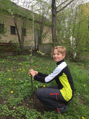 April 2017: Auf unser weitläufiges, grünes Schulgelände mit den vielen Rückzugsbereichen – von unseren Hausmeisterinnen fleißig gestaltet und gepflegt – können wir zurecht stolz sein. Ein besonderes Kleinod ist das kleine Biotop im Zentrum unserer Anlage. Seine Pflege und Neugestaltung haben sich Frau Baldschus und ihre Klasse 6/4 auf die Fahne geschrieben. Eine erste Maßnahme war das Auspumpen des kleinen Teiches. Wir danken Herrn Berthold für seine Unterstützung dabei. Weitere, umfangreiche Bepflanzungen sind geplant. Besonders die aktiven Sechstklässler wird es freuen, die Ergebnisse ihrer Arbeit täglich vor Augen zu haben. Der besondere Stolz der Klasse 6/4 ist der Apfelbaum, den Hunor Kakay der Schule geschenkt hat und der seit April neben der Sporthalle steht. Er kann nun in den nächsten Jahren beim Wachsen beobachtet werden. Und wer weiß – vielleicht ist er in sechs Jahren auf einem Abschlussfoto der Klasse zu sehen …
