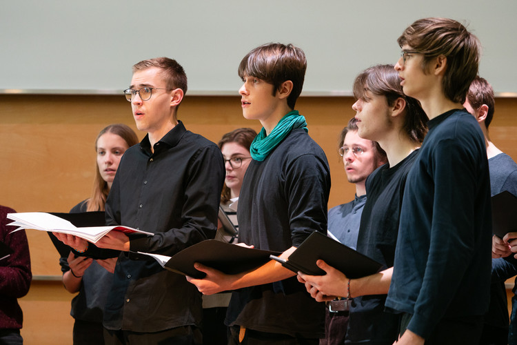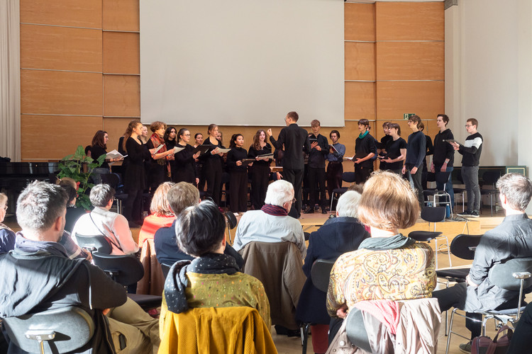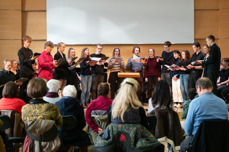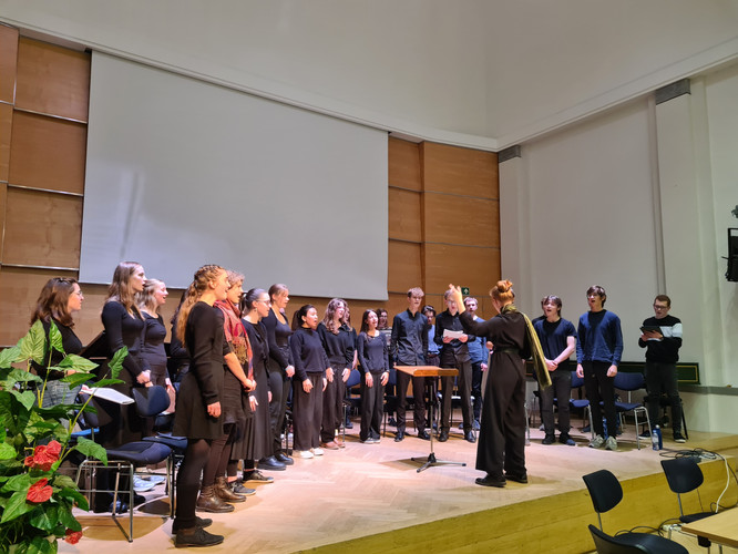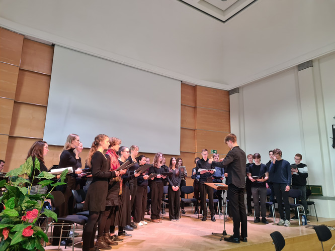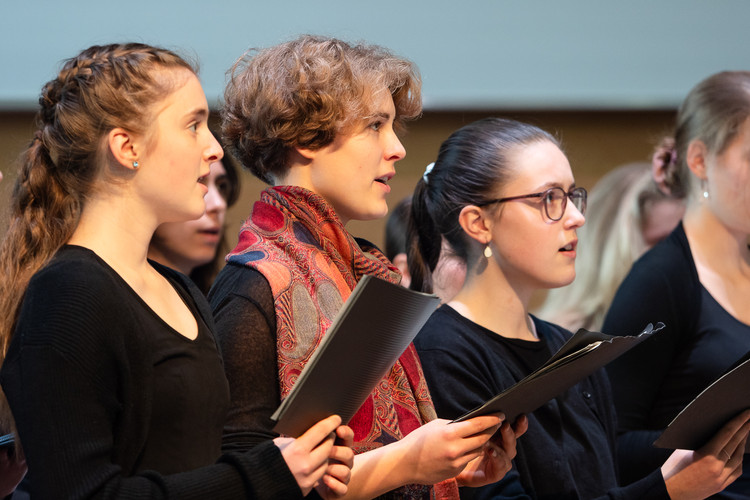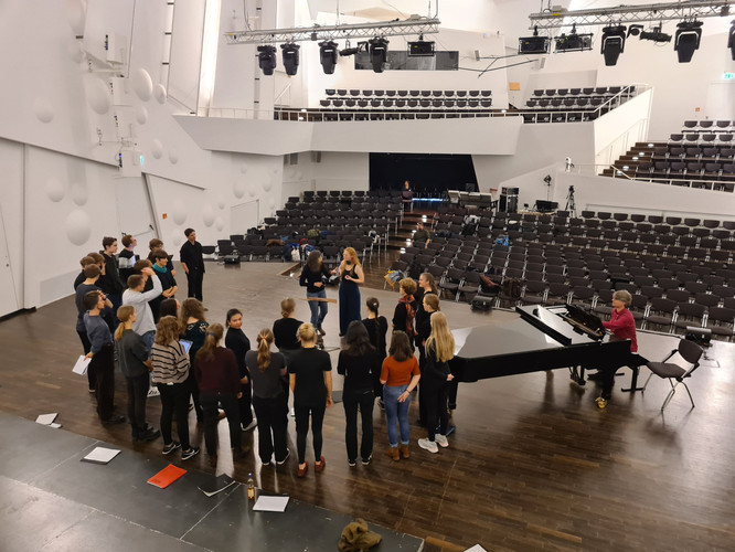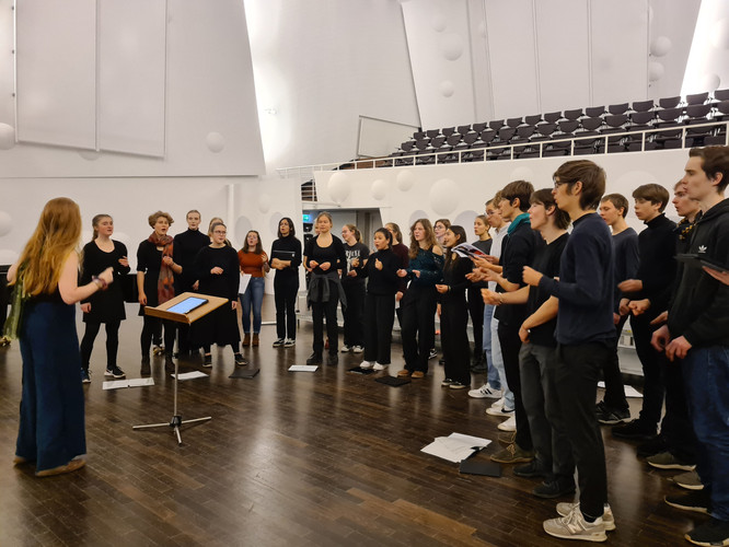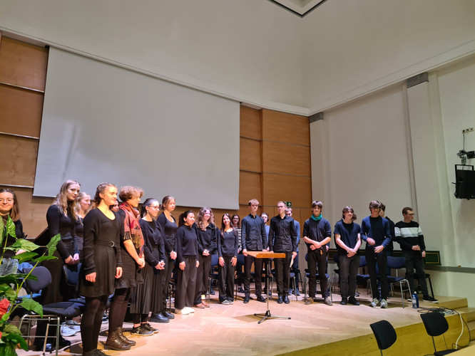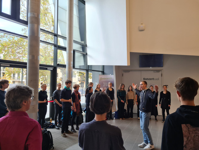 Der Oberstufenchor trat sowohl im Eröffnungskonzert unter seiner Leiterin und Musiklehrerin Siegrid Folprecht als auch in der Abschlussveranstaltung unter der Leitung von Schulmusikstudierenden, die vorher mit dem Chor geprobt hatten, auf. Beide Konzerte standen unter dem Motto „Verleih uns Frieden“. Ein besonderer Moment war das von allen Schulchören gemeinsam mit dem Chor der Studierenden gesungene „Da Pacem“ von Heinrich Schütz – eine innige Bitte um Frieden!