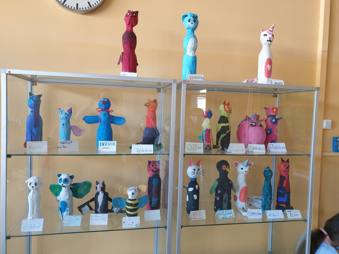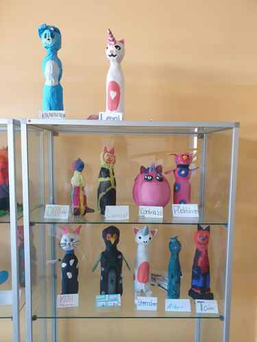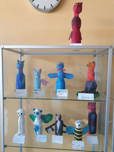 Die Klasse 5/3 hat 3D-Pokemons erschaffen. Ezana, Totolo, Disco-Bot und andere Figuren entstanden aus einer Flasche, Zeitung und Tapetenkleister. Nach zwei Doppelstunden konnte man die Tierchen bunt gestalten. Wenn man wollte, konnte man auch Details wie Schnurrbart, Haare oder eine Brille herstellen und anbringen. Nachdem die Pokemons fertig geworden waren, wanderten sie ins Foyer des Nebengebäudes, wo sie in die Schaukästen einzogen. Nun kann man sie dort bewundern.