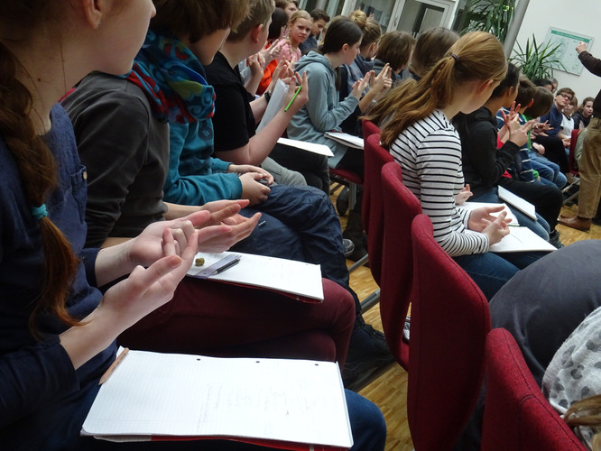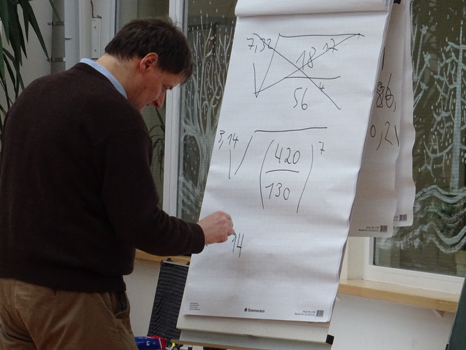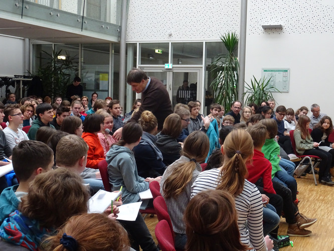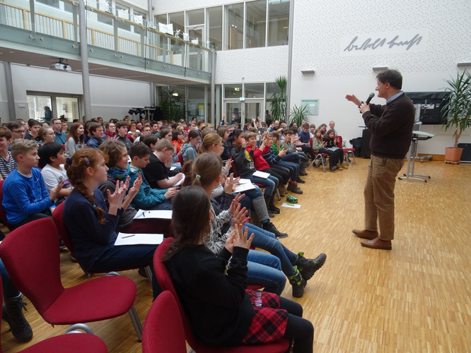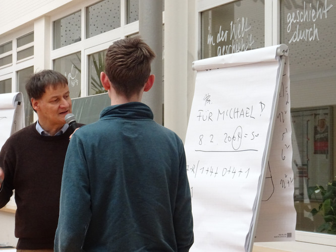 Gert Mittring betonte dabei, dass er selbst in seiner Schulzeit kein besonders aufmerksamer Schüler gewesen sei und dass er den negativen Emotionen, die oft mit dem Fach Mathematik verbunden seien, etwas entgegensetzen möchte. Das Spannende am Rechnen sei für ihn herauszufinden, wie man leichter rechnen kann, um damit das Auswendiglernen zu umgehen. Die anwesenden Schüler nahmen die Herausforderung an und so kamen die Taschenrechner nur zum Einsatz, um das Ergebnis zu überprüfen.