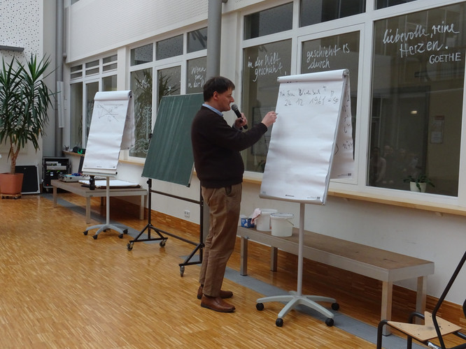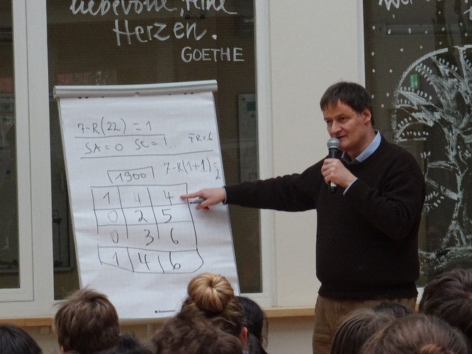 Dr. Dr. Gert Mittring, der Weltmeister im Kopfrechnen, war in der Aula unserer Schule zu Gast und gab den anwesenden Schülern und Lehrern einen Einblick in die Möglichkeiten der Vereinfachung von Rechenoperationen, indem er ihnen selbst entwickelte Algorithmen zeigte und erklärte. So konnten die Anwesenden konkret verfolgen, wie errechnet wurde, an welchem Wochentag Frau Wiedenbeck, eine unserer Mathematiklehrerinnen, geboren wurde. In einem zweiten Schwerpunkt erklärte Herr Mittring dem Publikum die Finger-Mathematik, die eine Hilfe für komplexe Multiplikationsaufgaben sein kann. Dabei bezog er die Anwesenden aktiv mit ein und entwickelte seine Rechenwege gemeinsam mit dem Publikum, das fleißig und aufmerksam mitrechnete.