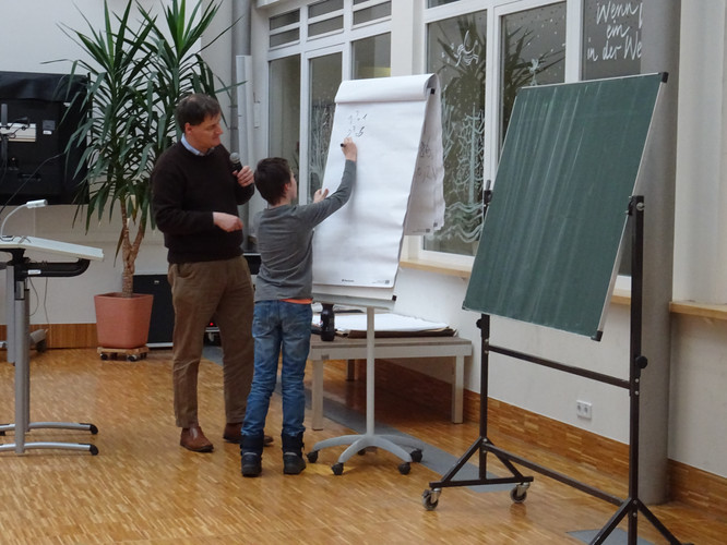 Besonders die jungen Schüler erwiesen sich als bemerkenswert schnelle Kopfrechner, die dem Experten außerdem mutig Fragen stellten. Konzentration war gefragt, denn trotz aller Vereinfachung herrschte ein hohes Rechentempo und der Schwierigkeitsgrad wurde gesteigert bis hin zu manchem Exkurs „für die Freaks“. Seine eigenen Rechenfähigkeiten stellte Gert Mittring dem Publikum in einer Freestyle-Aufgabe unter Beweis.